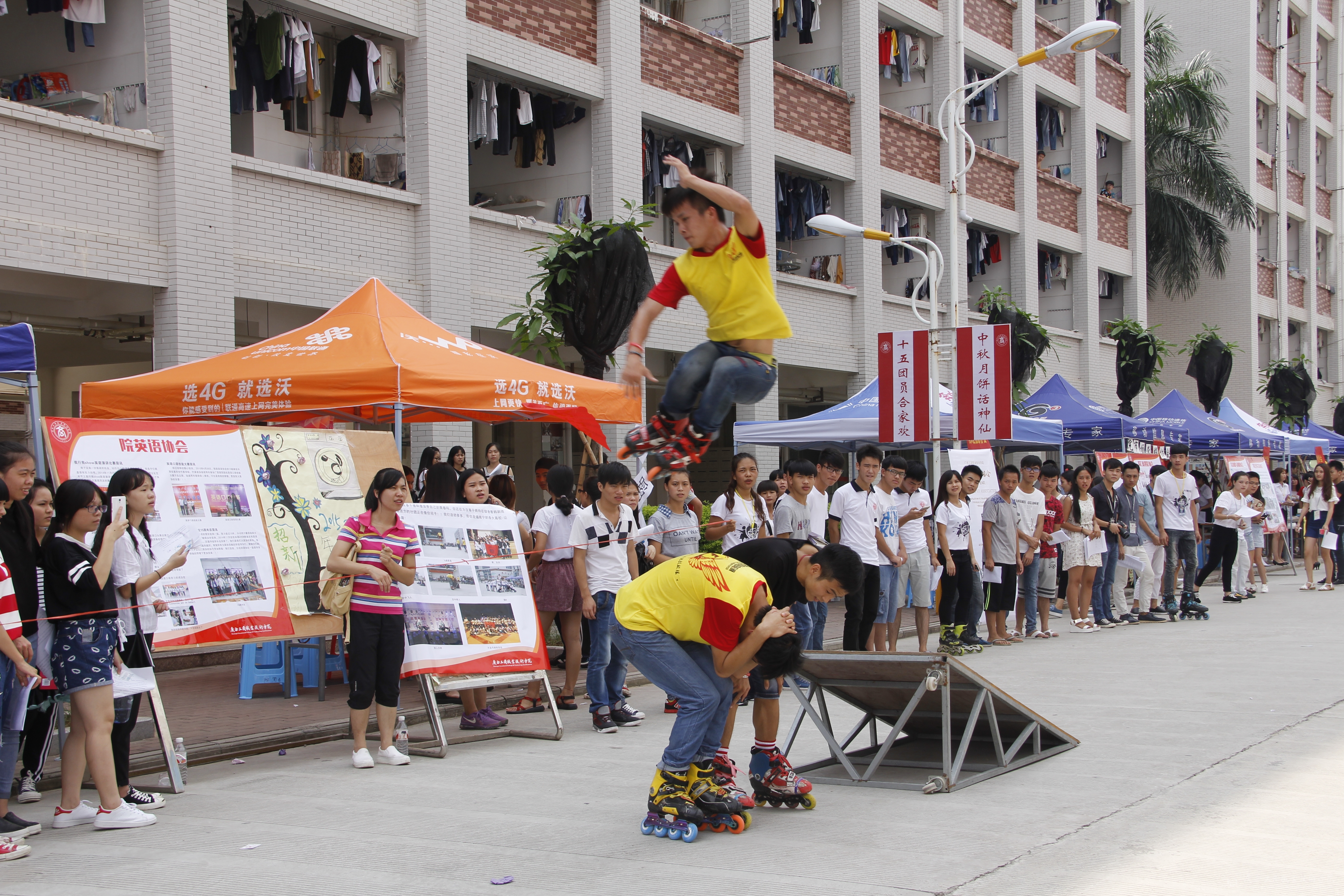 2015年9月28日12時(shí),學(xué)院和各系共33個(gè)協(xié)會(huì)的招新活動(dòng)在校園內(nèi)展開。為了能吸引到更多新生的關(guān)注和加入,各個(gè)協(xié)會(huì)更是做足噱頭:歌舞、COSPLAY、花式輪滑,在精彩的文藝表演中,招新活動(dòng)熱鬧開幕。招新現(xiàn)場(chǎng)人山人海,熱鬧非凡,在校園里形成一道靚麗的風(fēng)景線。