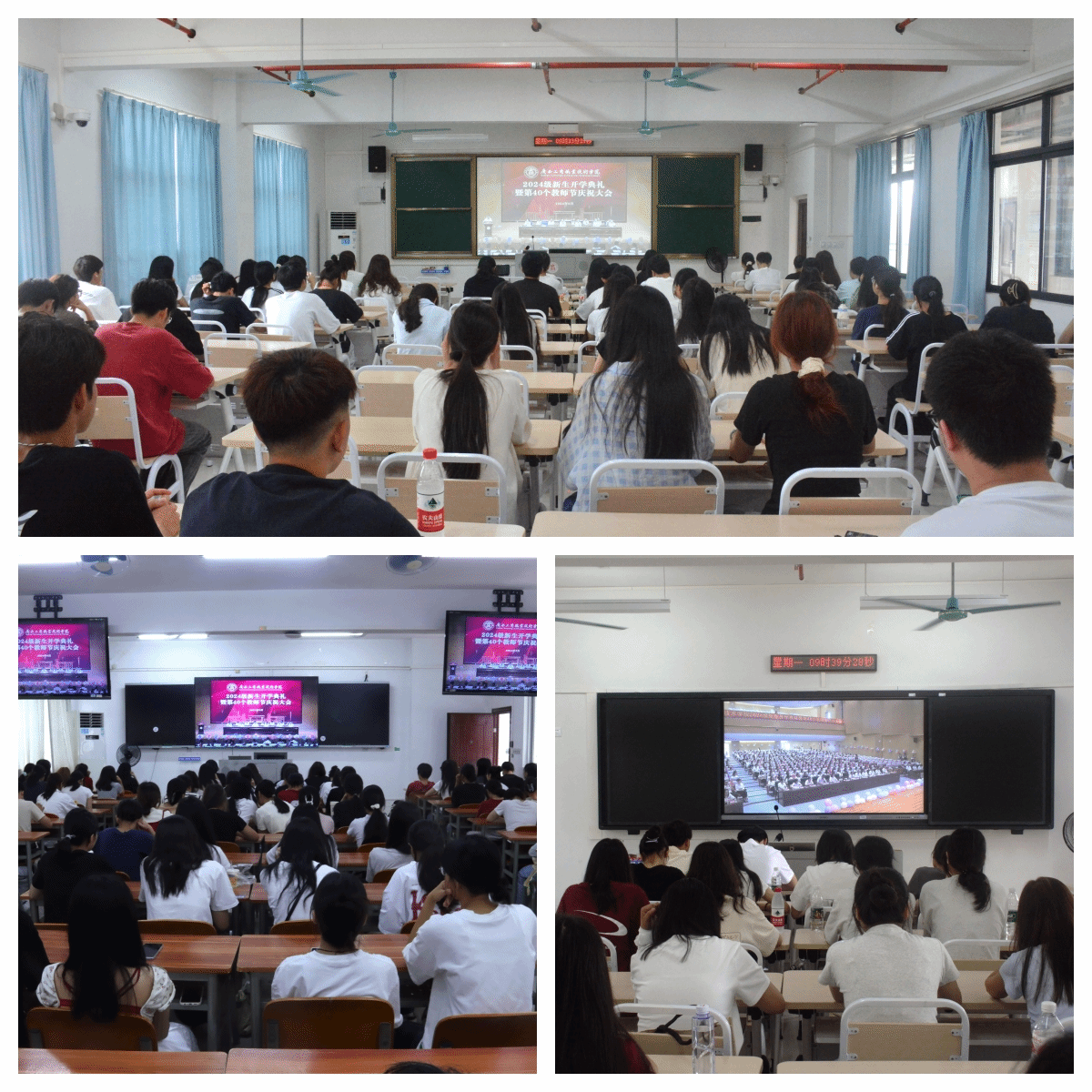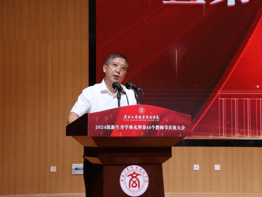 金秋九月,碩果盈枝。為熱烈歡迎2024級新生到學(xué)校學(xué)習(xí),隆重慶祝第40個教師節(jié),9月9日上午,我校以線上線下相結(jié)合的方式在武鳴校區(qū)、鵬飛校區(qū)、中堯校區(qū)同步舉行2024級新生開學(xué)典禮暨第40個教師節(jié)慶祝大會。學(xué)校領(lǐng)導(dǎo)李維、劉進、安仲文、陳寧春、韋云鳳、闕勇平,各單位、各部門主要負責(zé)人,受表彰教師,新入職教師,武鳴校區(qū)2024級輔導(dǎo)員代表和武鳴校區(qū)2024級新生代表在線下主會場參會,全體2024級新生及各部門、各單位教職工在線上參會。學(xué)校黨委副書記安仲文主持大會。