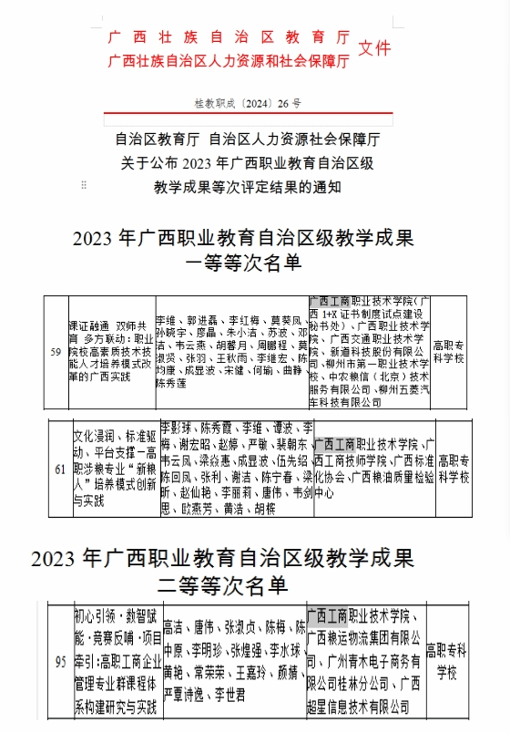 李維教授主持的《課證融通 雙師共育 多方聯(lián)動:職業(yè)院校高素質(zhì)技術(shù)技能人才培養(yǎng)模式改革的廣西實踐》和李影球教授主持的《文化浸潤、標準驅(qū)動、平臺支撐—高職涉糧專業(yè)“新糧人”培養(yǎng)模式創(chuàng)新與實踐》均獲得一等等次,高潔教授主持的《初心引領(lǐng)·數(shù)智賦能競賽反哺·項目牽引:高職工商企業(yè)管理專業(yè)群課程體系構(gòu)建研究與實踐》獲得自治區(qū)二等等次。