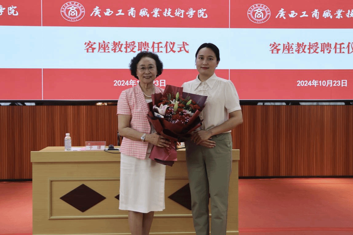 (學(xué)校馬克思主義學(xué)院黃雅璐老師(右)向于瑮教授(左)獻(xiàn)上鮮花)