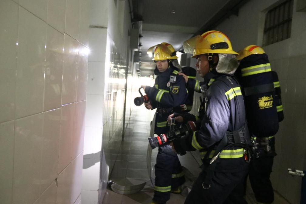 中午14:30,疏散演練開始,學(xué)生公寓模擬起火點(diǎn)開始點(diǎn)煙,火災(zāi)警報(bào)聲立即拉響。各公寓樓從高到低逐層疏散,在引導(dǎo)員的指引下,全體師生用毛巾捂住口鼻,沿著疏散通道采用彎腰低頭的姿勢,有序地疏散至安全地帶。