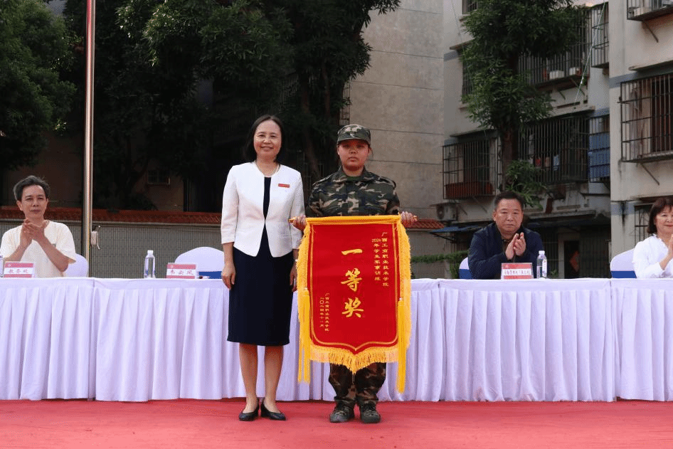 軍訓(xùn)匯演結(jié)束后,良慶區(qū)人民武裝部領(lǐng)導(dǎo)宣布會操結(jié)果。學(xué)校領(lǐng)導(dǎo)、良慶區(qū)人民武裝部領(lǐng)導(dǎo)、各二級學(xué)院有關(guān)負責(zé)人為獲獎班級頒發(fā)錦旗。