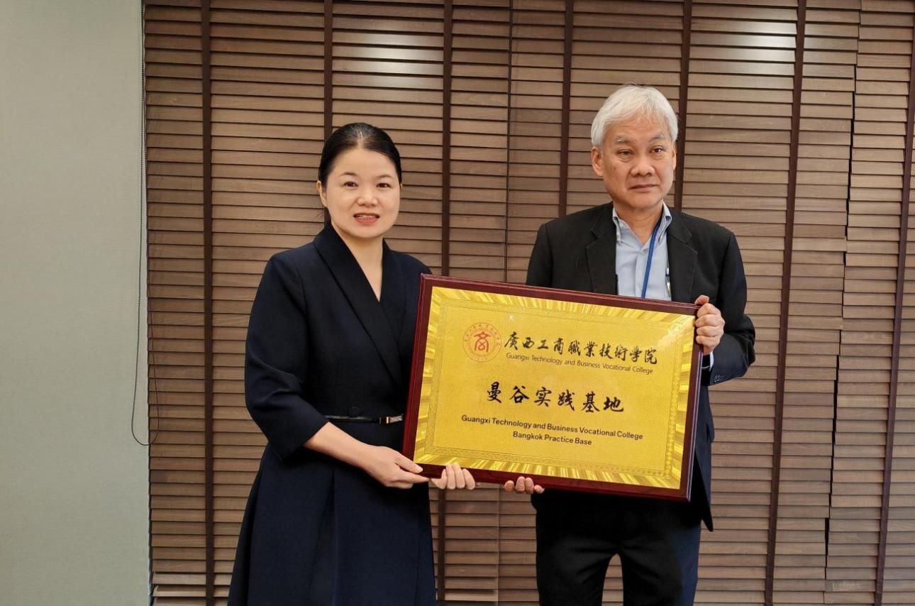 (廣西工商職業(yè)技術(shù)學(xué)院曼谷實踐基地授牌儀式。圖右為泰國正大管理學(xué)院副校長Somrote Komolavanij(宋洛)教授)