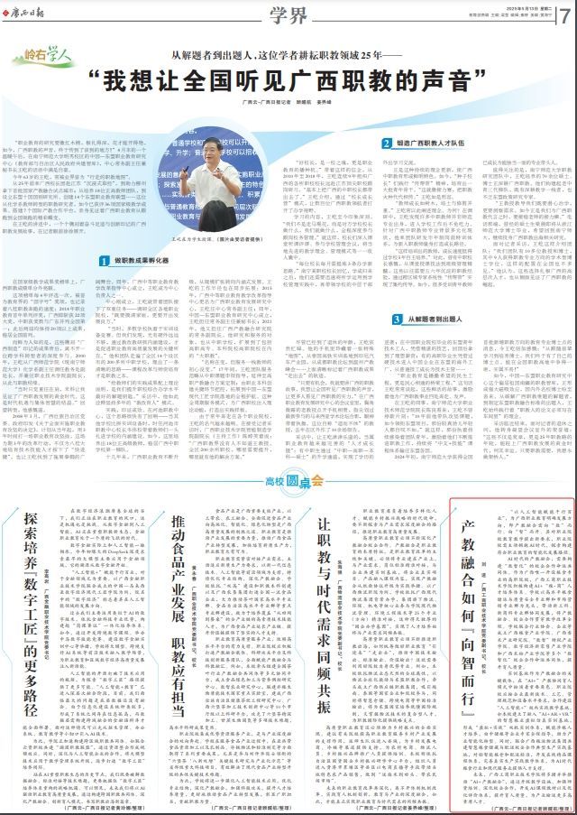 2025年5月13日,《廣西日報》學(xué)界版刊發(fā)學(xué)校黨委副書記、校長劉進署名文章,標題為《產(chǎn)教融合如何“向智而行”》,全文如下: