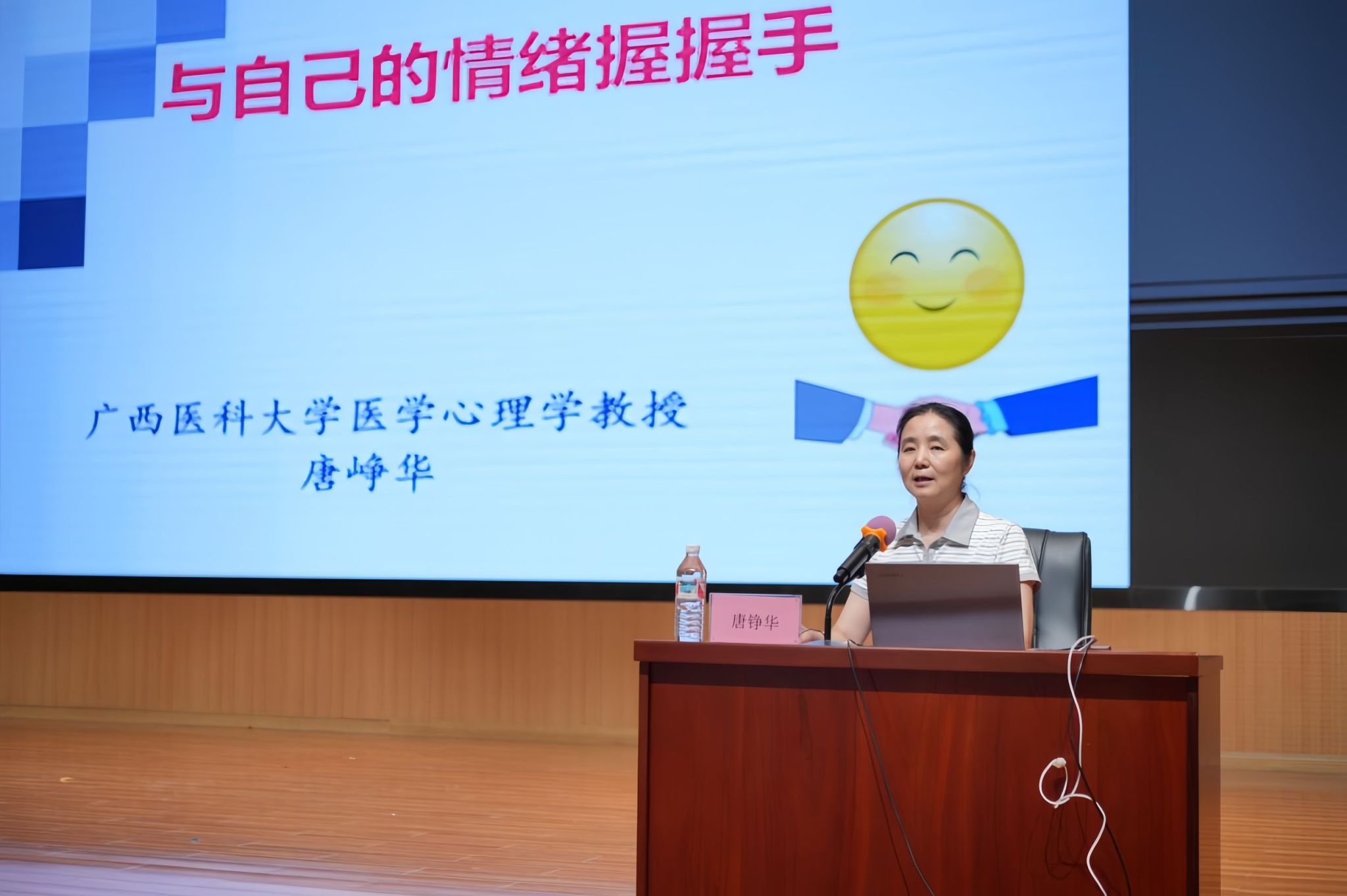 簽約揭牌儀式后,參會領(lǐng)導嘉賓一起觀看了第2個全國學生心理健康宣傳教育月活動啟動儀式文藝表演,并參觀了學?!耙徽臼健睂W生社區(qū)和校心理中心,進一步了解學校心理健康教育工作的開展情況;同時,學校也邀請了廣西醫(yī)科大學醫(yī)學心理學唐崢華教授,為參加啟動儀式的600余名師生開展了《與自己的情緒握握手》心理健康教育主題講座。