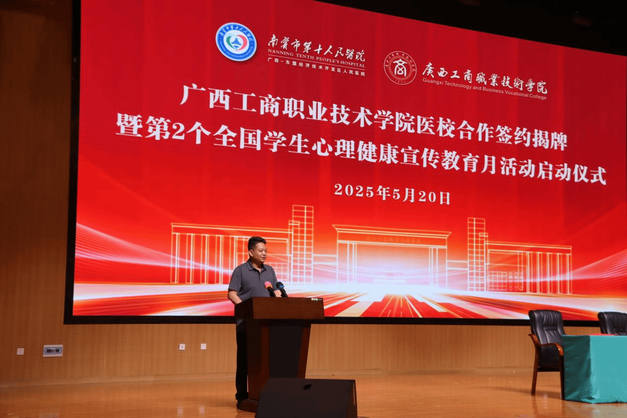 為貫徹落實《教育部辦公廳關(guān)于開展第2個全國學生心理健康宣傳教育月活動的通知》有關(guān)要求,同時切實加強醫(yī)校合作,推動學生心理健康工作提質(zhì)增效,促進學生身心健康發(fā)展。2025年5月20日下午,學校學生工作處心理健康教育與咨詢中心在武鳴校區(qū)學術(shù)活動中心開展醫(yī)校合作簽約揭牌暨2025年第2個全國學生心理健康宣傳教育月活動啟動儀式。出席本次活動的領(lǐng)導及嘉賓有:廣西東盟經(jīng)開區(qū)管委會黨工委副書記韋耿,南寧市第十人民醫(yī)院院長朱云峰,學校黨委學工部部長譚波,副部長李朝鋒、心理健康教育與咨詢中心副主任陳寧以及南寧市第十人民醫(yī)院相關(guān)診療科室負責人醫(yī)師和師生代表。