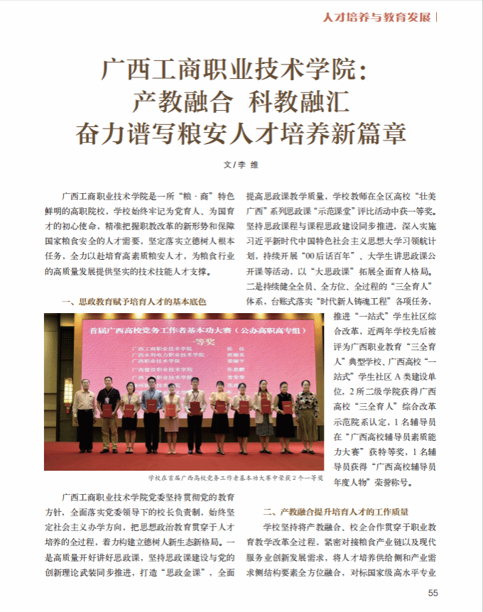 近日,《中國(guó)糧食經(jīng)濟(jì)》刊發(fā)學(xué)校黨委書(shū)記李維署名文章,標(biāo)題為《廣西工商職業(yè)技術(shù)學(xué)院:產(chǎn)教融合 科教融匯 奮力譜寫(xiě)糧安人才培養(yǎng)新篇章》,全文如下: