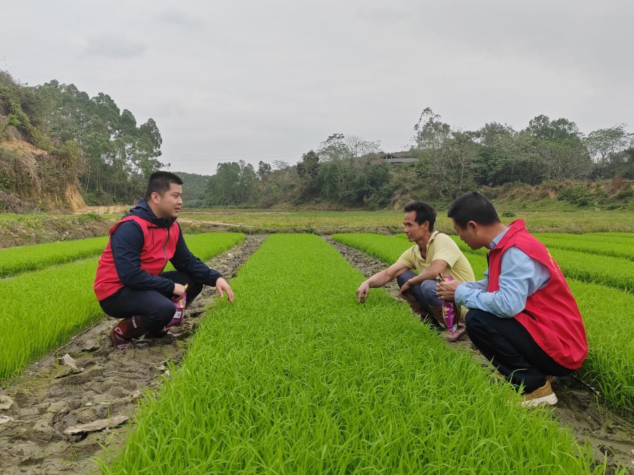(鐘全和駐村隊(duì)員到田地了解水稻秧苗培育情況)