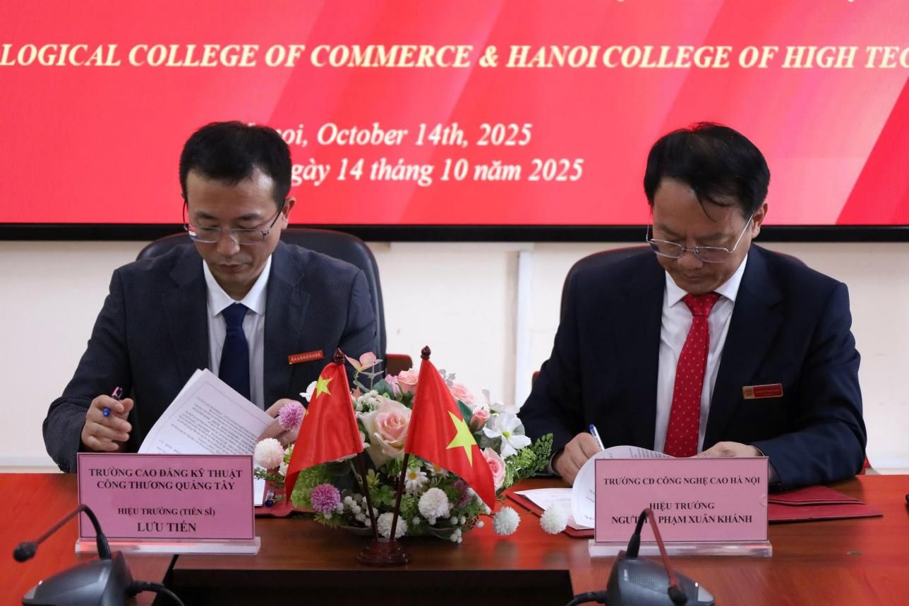 在河內(nèi)高科技學(xué)院,代表團受到校長范春慶、副校長黎名光等校方代表的熱情接待。雙方通過視頻展示各自辦學(xué)特色,并就職業(yè)教育創(chuàng)新發(fā)展、師生交流項目、“中文+專業(yè)技能”課程開發(fā)、共建中國-東盟現(xiàn)代工匠學(xué)院等議題進行了深入研討。為進一步深化合作,推動中越院校在教育教學(xué)經(jīng)驗共享、人才聯(lián)合培養(yǎng)等方面協(xié)同發(fā)展,雙方正式簽署合作備忘錄。座談會后,代表團參觀了該校校園及實驗實訓(xùn)基地,深入了解其教學(xué)設(shè)施與實踐教學(xué)模式。