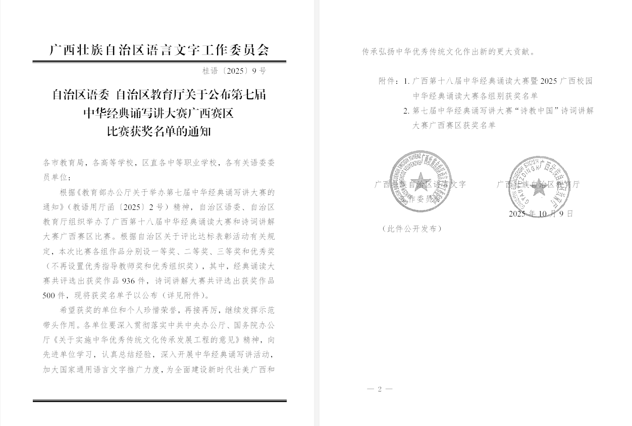 近日,廣西壯族自治區(qū)語(yǔ)言文字工作委員會(huì)、廣西壯族自治區(qū)教育廳公布了第七屆中華經(jīng)典誦寫講大賽廣西賽區(qū)比賽獲獎(jiǎng)名單,我校師生在本屆賽事中再創(chuàng)歷史新高: