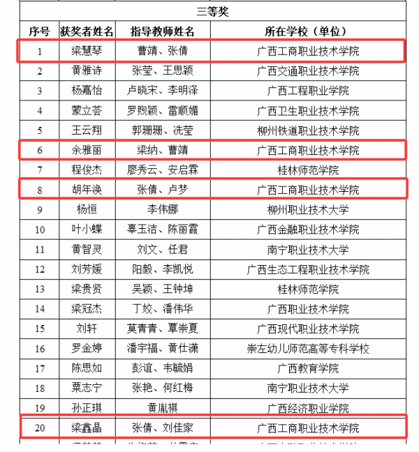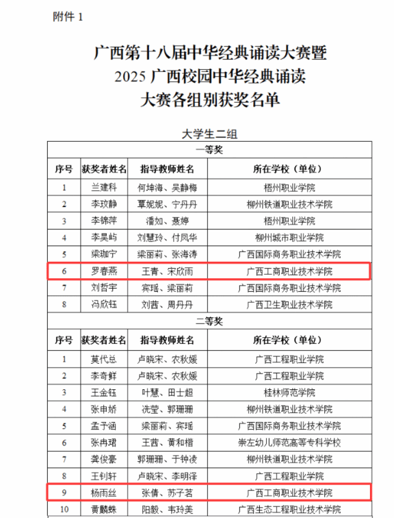 其中,在廣西第十八屆中華經(jīng)典誦讀大賽暨2025廣西校園中華經(jīng)典誦讀大賽大學(xué)生二組獲一等獎(jiǎng)1項(xiàng)、二等獎(jiǎng)1項(xiàng)、三等獎(jiǎng)4項(xiàng),教師三組(非專業(yè)教師)獲一等獎(jiǎng)2項(xiàng)、優(yōu)秀獎(jiǎng)1項(xiàng),教師三組(專業(yè)教師)獲優(yōu)秀獎(jiǎng)1項(xiàng),大學(xué)生集體組獲優(yōu)秀獎(jiǎng)1項(xiàng)。在第七屆中華經(jīng)典誦寫講大賽"詩(shī)教中國(guó)"詩(shī)詞講解大賽(廣西賽區(qū))大學(xué)教師組獲二等獎(jiǎng)1項(xiàng)、優(yōu)秀獎(jiǎng)1項(xiàng)。