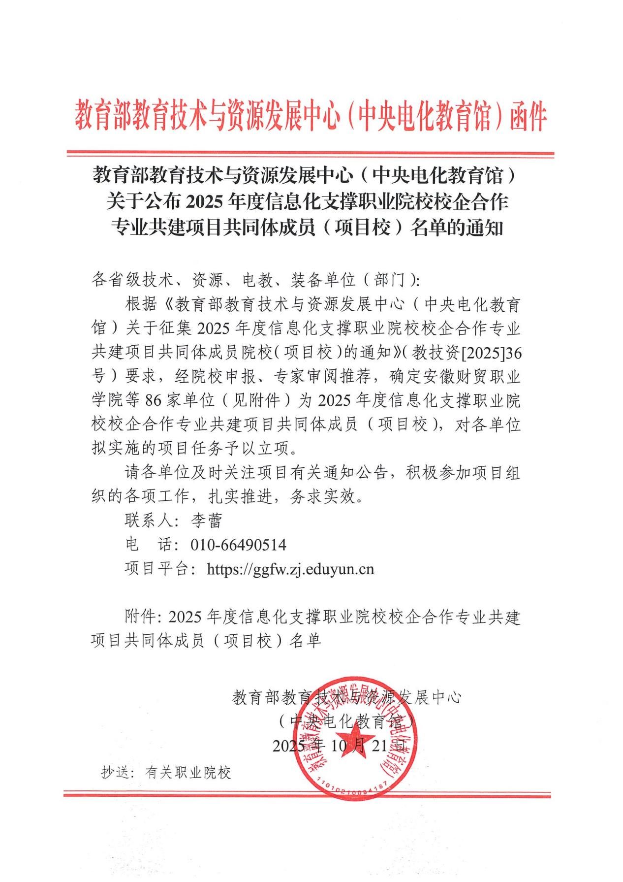 近日,教育部教育技術(shù)與資源發(fā)展中心(中央電化教育館)公布2025年度“信息化支撐職業(yè)院校校企合作專業(yè)共建項目”共同體成員名單,經(jīng)過嚴格的資格審查與專家評議,我校成功入選成為項目共同體成員。
