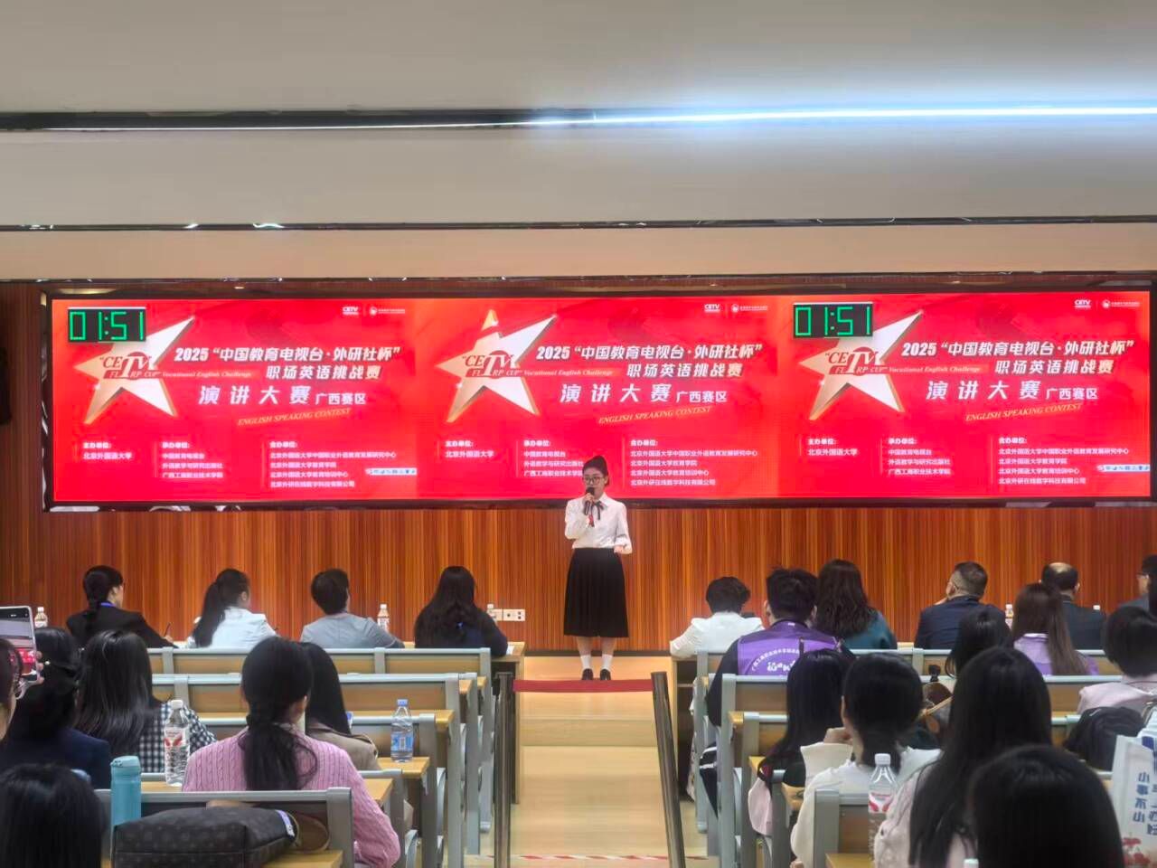 2025年“中國教育電視臺·外研社杯”職場英語挑戰(zhàn)賽廣西賽區(qū)比賽于11月2日順利落幕,本次大賽分為英語演講與英語寫作兩個賽項(xiàng)。11月1日,英語演講賽項(xiàng)在我校成功舉辦。