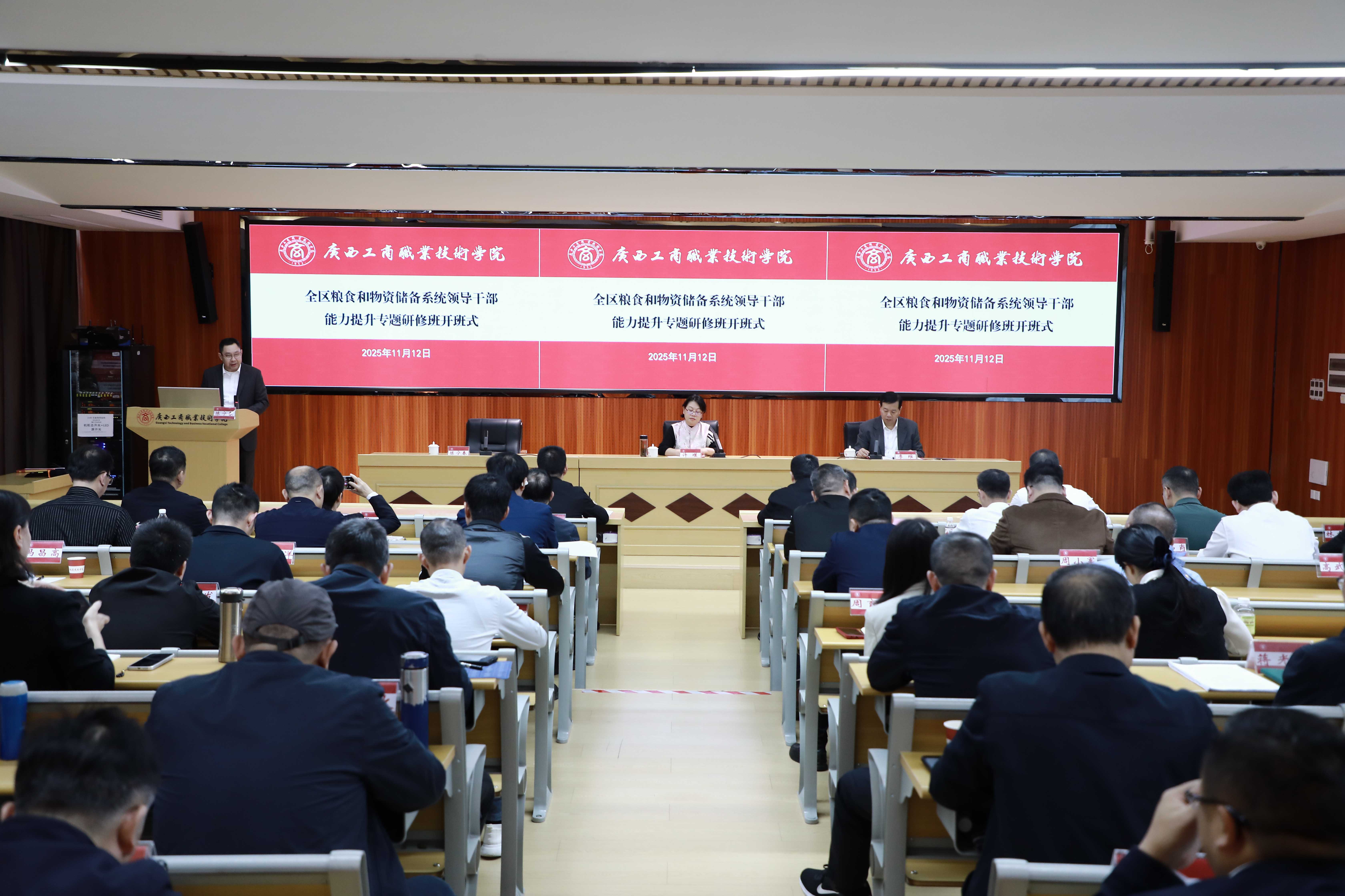 2025年11月12日,由我校承辦的全區(qū)糧食和物資儲備系統(tǒng)領(lǐng)導(dǎo)干部能力提升專題研修班順利開班。自治區(qū)發(fā)展改革委黨組成員,一級巡視員,自治區(qū)糧食和物資儲備局黨組書記、局長許瑾,廣西工商職業(yè)技術(shù)學(xué)院黨委書記李維出席開班式。學(xué)校副校長陳寧春主持開班式。本次研修班參訓(xùn)人員共計70余人,培訓(xùn)對象涵蓋局領(lǐng)導(dǎo)、各市(含部分縣、區(qū))糧食和儲備局主要領(lǐng)導(dǎo)及業(yè)務(wù)科室負(fù)責(zé)人、局機(jī)關(guān)處室負(fù)責(zé)人和業(yè)務(wù)骨干、直屬單位(含儲備糧集團(tuán)子公司)負(fù)責(zé)人和業(yè)務(wù)分管領(lǐng)導(dǎo)。