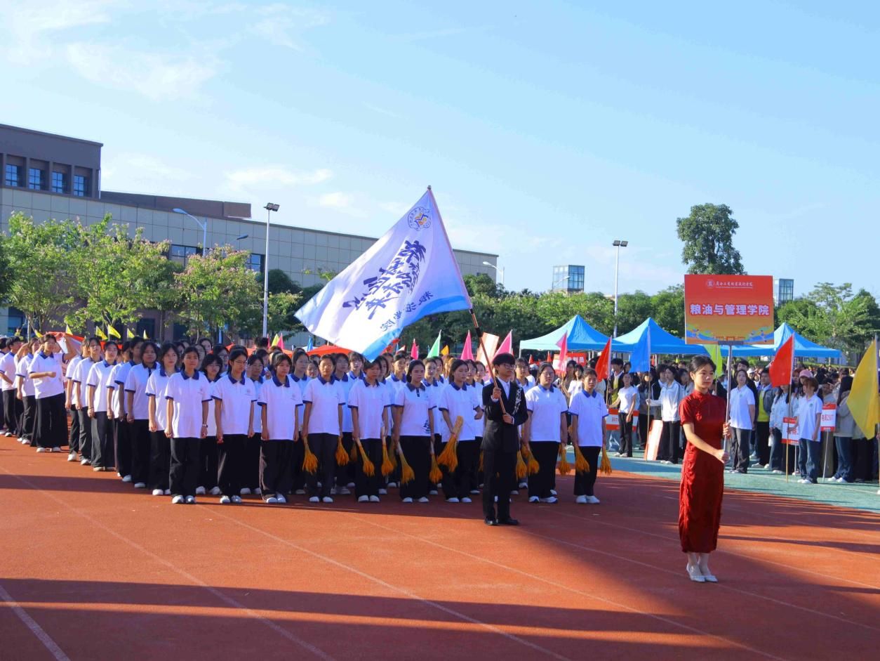 學校武術協(xié)會的舞龍舞獅表演熱鬧登場,鑼鼓聲震天,龍獅騰躍。在莊嚴激昂的旋律伴隨下,國旗方隊、校旗方隊、會旗方隊、各二級學院代表方隊、裁判員方隊步履穩(wěn)健,神態(tài)莊重地依次入場。隊列氣勢磅礴,井然有序,觀眾席中掌聲如潮水般洶涌,歡呼聲此起彼伏,為這場運動盛宴注入了無限的熱情與活力,彰顯了運動健兒們面對挑戰(zhàn)、勇于拼搏的精神特質。