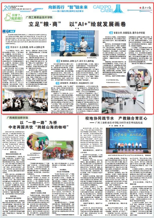 2025年9月17日,《廣西日報》刊登學校校長劉進署名文章,標題為:《立足“糧·商” 以“AI+”繪就發(fā)展畫卷》,全文如下: