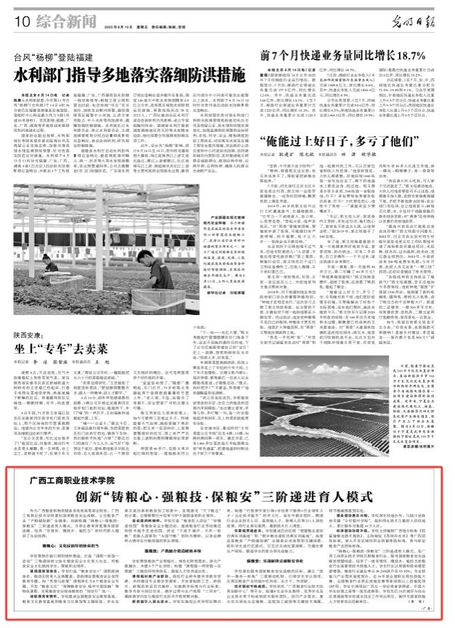 2025年8月15日,《光明日報》刊登學(xué)校黨委書記李維署名文章,標(biāo)題為:《廣西工商職業(yè)技術(shù)學(xué)院創(chuàng)新“鑄糧心·強糧技·保糧安”三階遞進育人模式》,全文如下:
