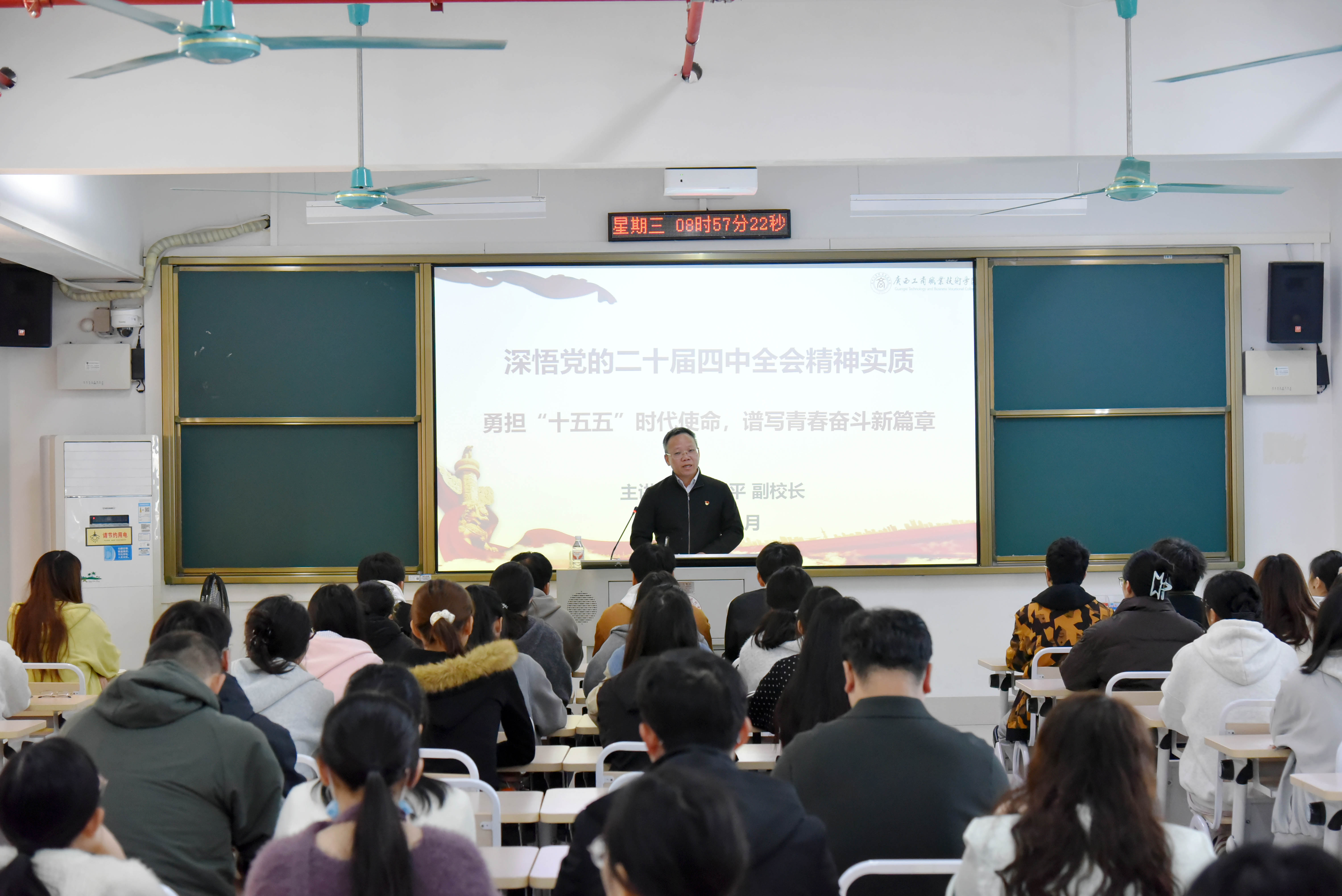 在專題授課中,闕勇平副校長以《深悟黨的二十屆四中全會精神實(shí)質(zhì) 勇?lián)笆逦濉睍r(shí)代使命,譜寫青春奮斗新篇章》為題,從四個(gè)方面展開系統(tǒng)講解:一是回顧“十四五”時(shí)期我國發(fā)展取得的重大成就;二是闡釋“十五五”時(shí)期經(jīng)濟(jì)社會發(fā)展的重大意義;三是解讀黨的二十屆四中全會擘畫的未來藍(lán)圖;四是說明黨的二十屆四中全會精神對大學(xué)生成長成才的現(xiàn)實(shí)指引。授課過程中,他緊扣時(shí)代脈搏,將政策精神與社會現(xiàn)實(shí)相結(jié)合,用通俗易懂的語言幫助同學(xué)們準(zhǔn)確把握全會精神的核心要義,引導(dǎo)大家把人生理想融入強(qiáng)國建設(shè)、民族復(fù)興偉業(yè)的時(shí)代洪流,更加堅(jiān)定勇?lián)笆逦濉睍r(shí)代使命的信念與責(zé)任。