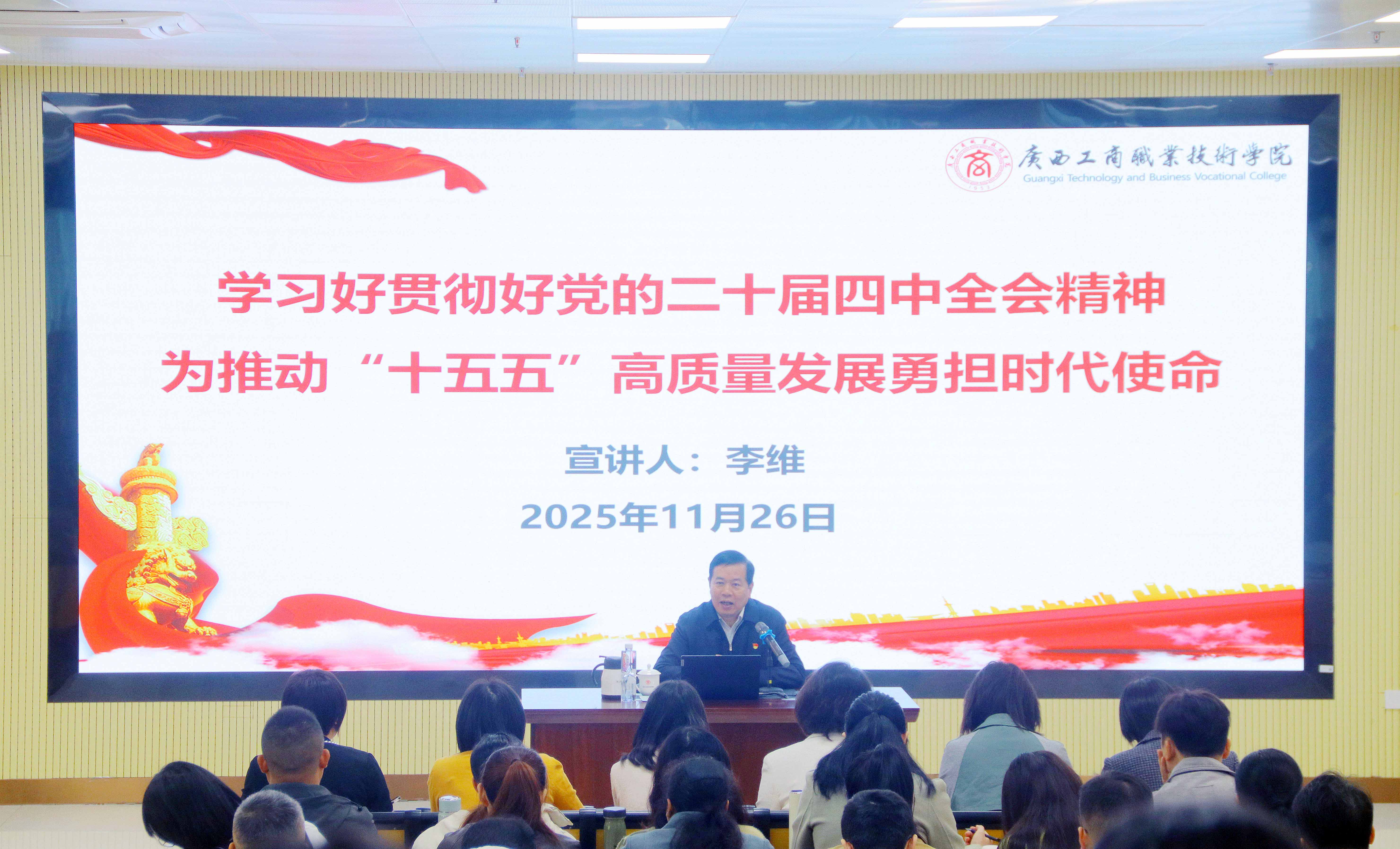 為深入學(xué)習(xí)貫徹黨的二十屆四中全會(huì)精神,準(zhǔn)確把握黨中央對(duì)“十五五”時(shí)期發(fā)展的戰(zhàn)略部署,統(tǒng)一思想、凝聚共識(shí),2025年11月26日,學(xué)校黨委書記李維在武鳴校區(qū)為師生宣講黨的二十屆四中全會(huì)精神。黨委組織部(學(xué)院人事處)、黨委宣傳部黨支部黨員代表、馬克思主義學(xué)院教師代表、學(xué)校青馬班及青年學(xué)生代表200多人參加。宣講活動(dòng)由黨委宣傳部部長(zhǎng)廖顯圖主持。