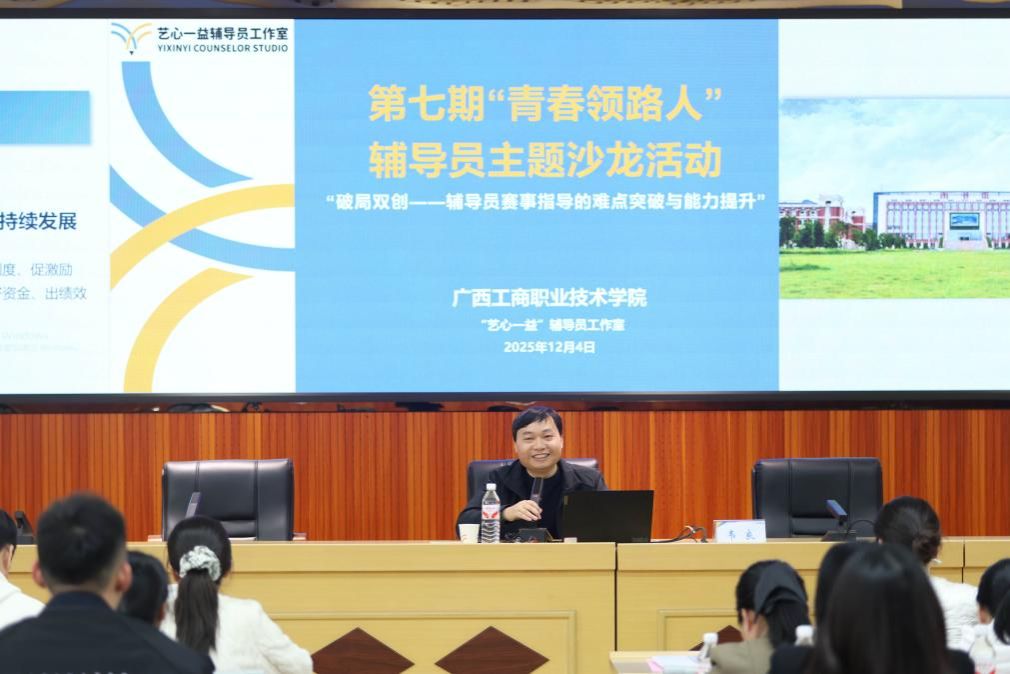 2025年12月4日,由廣西工商職業(yè)技術(shù)學(xué)院藝心一益輔導(dǎo)員工作室承辦的第七期“青春領(lǐng)路人”輔導(dǎo)員主題沙龍?jiān)邬i飛校區(qū)成功舉行。本次沙龍以“破局雙創(chuàng)——輔導(dǎo)員賽事指導(dǎo)的難點(diǎn)突破與能力提升”為主題,匯聚了區(qū)內(nèi)多所高職院校的輔導(dǎo)員代表,旨在通過(guò)深度交流與智慧碰撞,共同破解指導(dǎo)難題,提升育人本領(lǐng),強(qiáng)化輔導(dǎo)員作為學(xué)生成長(zhǎng)“青春引路人”的使命擔(dān)當(dāng)。學(xué)校黨委學(xué)生工作部(處)負(fù)責(zé)人、各二級(jí)學(xué)院代表、全體專職輔導(dǎo)員及兄弟院校代表應(yīng)邀參加。
