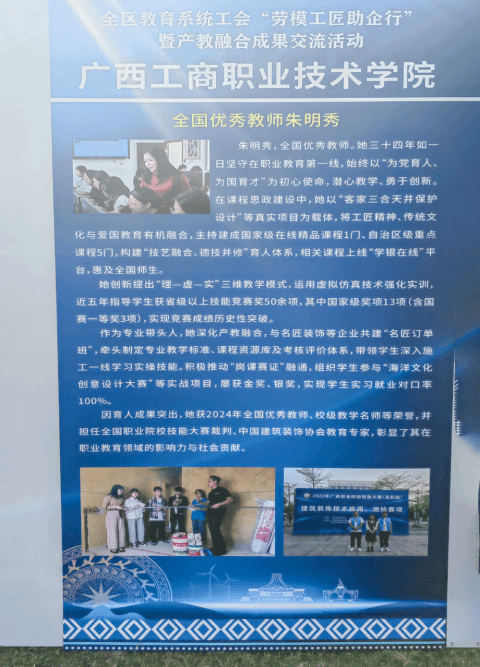 12月18日,由自治區(qū)教育工會(huì)主辦的全區(qū)教育系統(tǒng)工會(huì)“勞模工匠助企行”暨產(chǎn)教融合成果交流活動(dòng)在廣西機(jī)電職業(yè)技術(shù)學(xué)院舉行。本次活動(dòng)旨在推廣勞模精神、工匠精神,深化產(chǎn)教融合、校企合作,促進(jìn)職業(yè)教育與產(chǎn)業(yè)需求緊密對接。我校全國優(yōu)秀教師、無黨派人士朱明秀教授教學(xué)成果入選全區(qū)教育系統(tǒng)工會(huì)“勞模工匠助企行”暨產(chǎn)教融合成果交流展。
