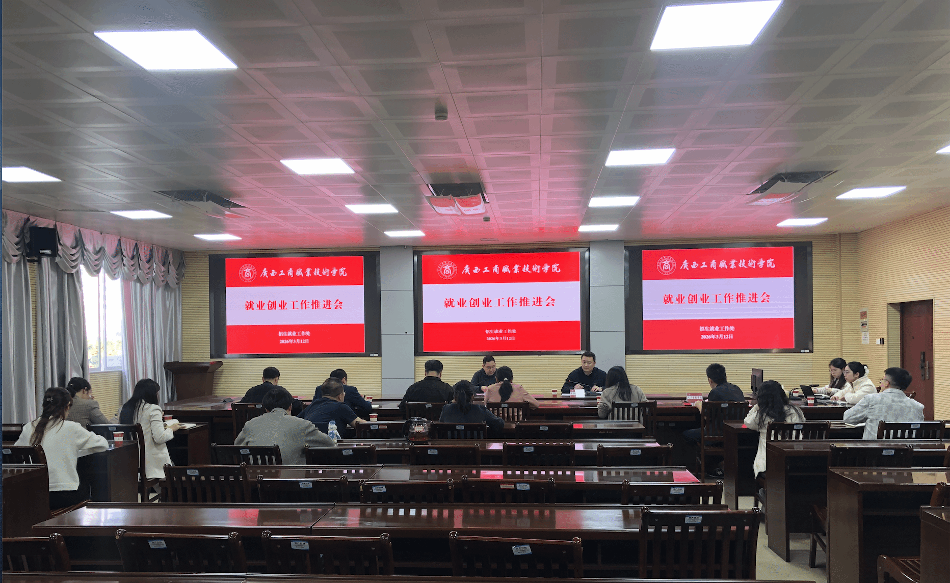 為扎實(shí)推進(jìn)2026年畢業(yè)生就業(yè)創(chuàng)業(yè)重點(diǎn)工作,全面落實(shí)訪企拓崗專項(xiàng)行動(dòng)部署,切實(shí)提升畢業(yè)生就業(yè)質(zhì)量與就業(yè)服務(wù)水平,3月12日,學(xué)校在鵬飛校區(qū)召開(kāi)2026年3月就業(yè)創(chuàng)業(yè)工作推進(jìn)會(huì)。學(xué)校副校長(zhǎng)陳寧春,招生就業(yè)工作處相關(guān)工作人員、各二級(jí)學(xué)院主要負(fù)責(zé)人、分管就業(yè)工作副院長(zhǎng)及就業(yè)干事參加會(huì)議。