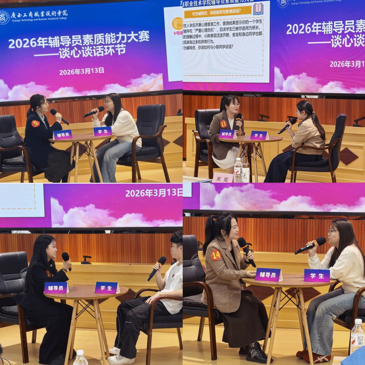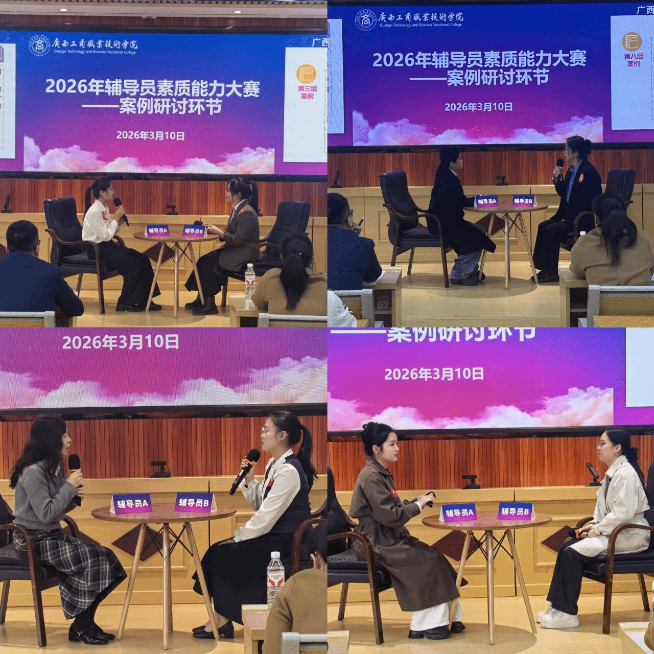 本次大賽由學(xué)校黨委學(xué)生工作部統(tǒng)籌組織,設(shè)置基礎(chǔ)知識測試、學(xué)情分析、案例研討、談心談話四個環(huán)節(jié),全面考察輔導(dǎo)員隊伍的理論素養(yǎng)、業(yè)務(wù)能力和實戰(zhàn)水平。1月14日,基礎(chǔ)知識測試和學(xué)情分析環(huán)節(jié)在鵬飛校區(qū)率先開展,采用閉卷作答方式,重點檢驗輔導(dǎo)員對理論知識的掌握程度,以及運用數(shù)據(jù)分析開展學(xué)生情況研判與精準(zhǔn)施策的能力。根據(jù)兩個環(huán)節(jié)的綜合得分,共有18名選手脫穎而出,晉級案例研討和談心談話環(huán)節(jié)決賽。3月10日,案例研討環(huán)節(jié)以“互問互答”的方式開展,參賽選手圍繞學(xué)生思想引領(lǐng)、學(xué)業(yè)指導(dǎo)、心理疏導(dǎo)、危機事件應(yīng)對等工作中的典型案例,相互提問并作答,聚焦問題本質(zhì)、理清解決思路、總結(jié)規(guī)律經(jīng)驗,充分展現(xiàn)輔導(dǎo)員分析問題、研判問題、解決問題的綜合能力。3月13日,談心談話環(huán)節(jié)模擬真實工作場景,參賽選手與學(xué)生演員圍繞學(xué)業(yè)困惑、人際沖突、情感困擾、就業(yè)壓力等話題開展面對面溝通,通過傾聽共情、價值引導(dǎo)、策略建議等方式,展現(xiàn)輔導(dǎo)員的溝通技巧和育人溫度。
