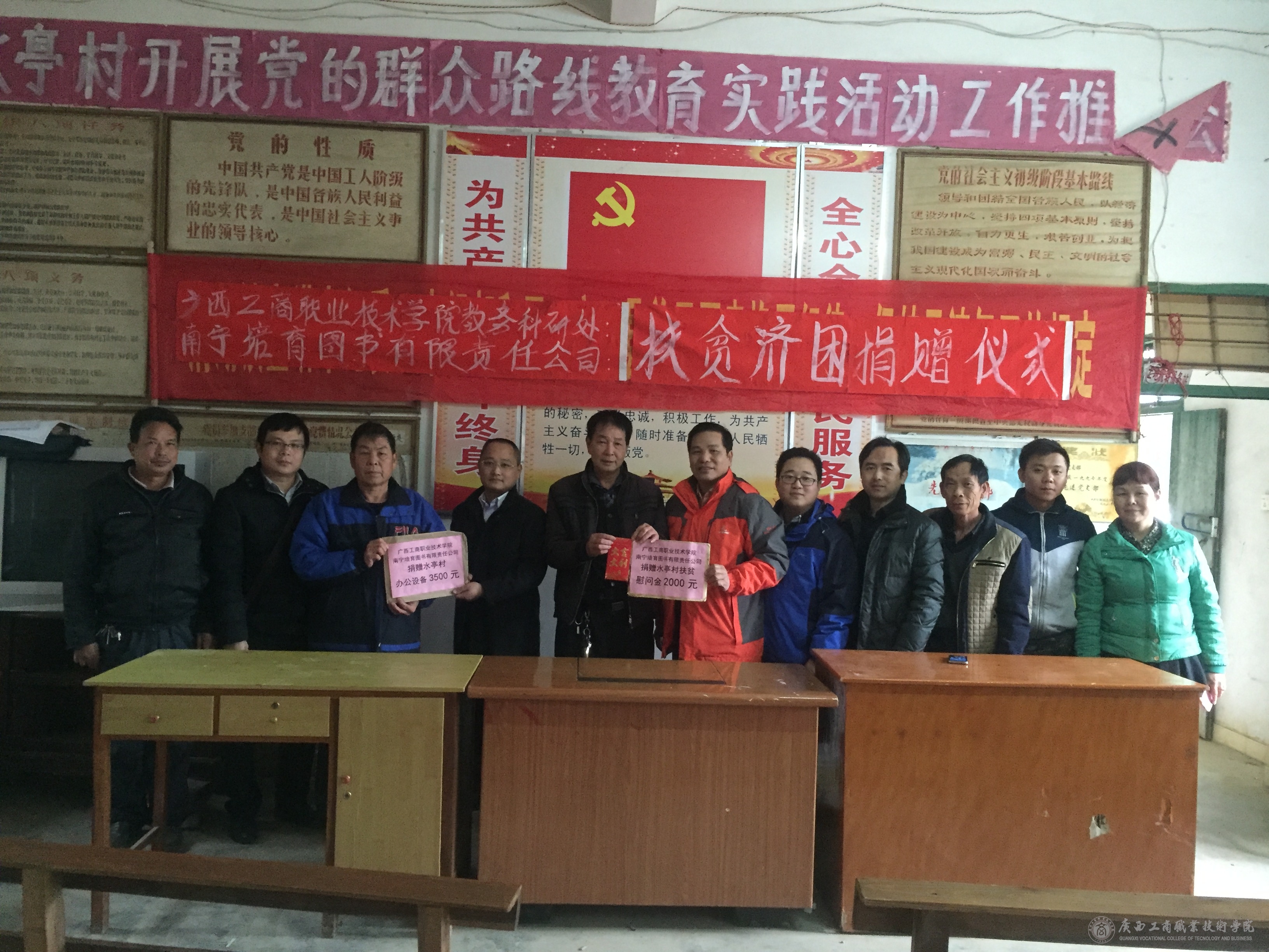 陸川縣清湖鎮(zhèn)水亭村是當(dāng)?shù)氐呢毨Т?,辦公條件非常簡(jiǎn)陋,群眾辦事非常不方便。教務(wù)科研處韋勝?gòu)?qiáng)處長(zhǎng)在該村進(jìn)行三個(gè)月的精準(zhǔn)扶貧識(shí)別過程中了解了這一情況,及時(shí)與南寧培育圖書有限責(zé)任公司領(lǐng)導(dǎo)溝通,決定教務(wù)科研處與公司共同向水亭村捐獻(xiàn)7張辦公桌,價(jià)值3500元。1月21日在水亭村委會(huì)議室舉行簡(jiǎn)短的捐贈(zèng)儀式,教務(wù)科研處韋勝?gòu)?qiáng)處長(zhǎng)、南寧培育圖書有限責(zé)任公司李光慶總經(jīng)理和村委會(huì)成員、精準(zhǔn)扶貧工作隊(duì)員參加了捐贈(zèng)儀式。水亭村黨總支書記李裕標(biāo)書記對(duì)教務(wù)科研處和南寧培育圖書有限責(zé)任公司表示衷心感謝,希望更多關(guān)注水亭村、幫助關(guān)心水亭村。