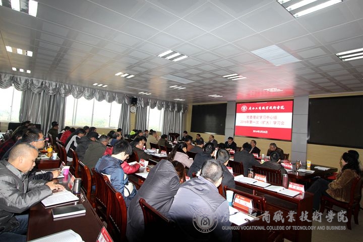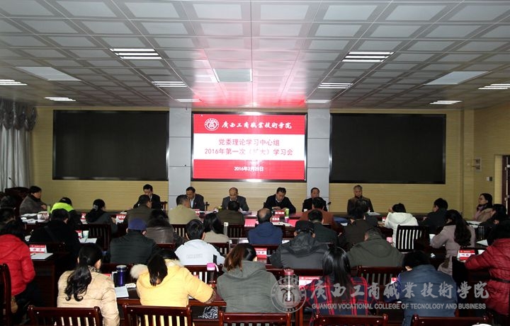 ? ? ? ? ?2016年2月25日上午,我院黨委理論學(xué)習(xí)中心組2016年第一次(擴(kuò)大)學(xué)習(xí)會在校本部視頻會議室召開。學(xué)院黨委書記覃武云主持會議,并做中心發(fā)言。院長陳杰、黨委副書記、紀(jì)委書記蒙啟成、副院長李仕欽、副院長李維、副廳級調(diào)研員黃永蓬參加學(xué)習(xí)會,并做了發(fā)言。學(xué)院中層以上領(lǐng)導(dǎo)干部參加了會議。