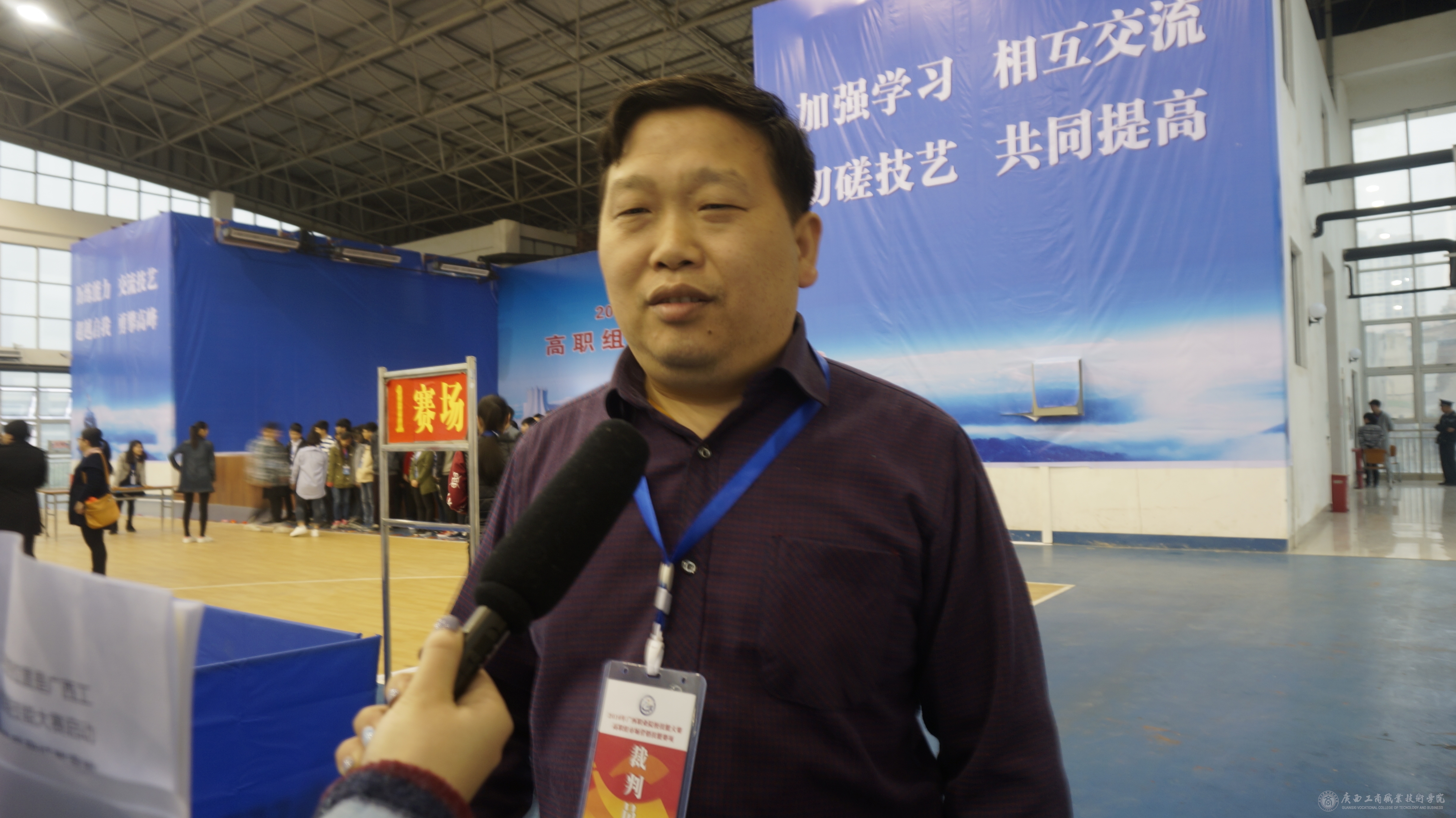市場營銷技能大賽開始前,學(xué)院黨委宣傳部新聞中心記者對裁判員、廣西職業(yè)技術(shù)學(xué)院、百色學(xué)院、南寧職業(yè)技術(shù)學(xué)院、賀州學(xué)院等高職院校的參賽隊伍進行采訪。采訪中廣西職業(yè)技術(shù)學(xué)院營銷系主任黃俊老師表示學(xué)生可以在此次技能比賽中完善一些商品推廣、銷售、理論知識以及營銷策略等方面的技能知識,有助于畢業(yè)以后到實踐來操作。