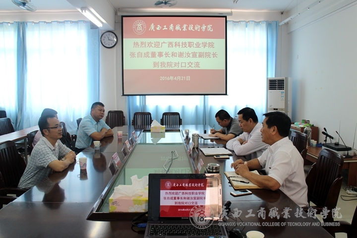 2016年4月21日上午,廣西科技職業(yè)技術(shù)學(xué)院張自成董事長(zhǎng)、謝汝宣副院長(zhǎng)和吳先夏副院長(zhǎng)一行到我院進(jìn)行對(duì)口交流。我校李維副院長(zhǎng)、教務(wù)科研處處長(zhǎng)韋勝?gòu)?qiáng)和教務(wù)處相關(guān)同志參與會(huì)議。