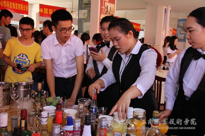 就業(yè)洽談會上,還安排了廣商院系列教學成果展演。酒店管理專業(yè)學生的西餐擺臺、中餐擺臺、餐巾花折疊、調(diào)酒表演等表演既展示出學生嫻熟的專業(yè)技能,也體現(xiàn)學院嚴謹專業(yè)的教學。同時,會計系學生在學生公寓架空層展示點鈔、珠算的技能,嫻熟的珠算打法,撥動的算珠敲擊著算盤框,聲聲連珠陣陣響,學生低頭認真點鈔,速度手法技巧令人折服。除此之外,書法與攝影作品展示,字跡工整,現(xiàn)場書法,吸引觀眾踴躍嘗試,題詞留下筆墨。學生各社團紛紛展示才藝,各展特色。