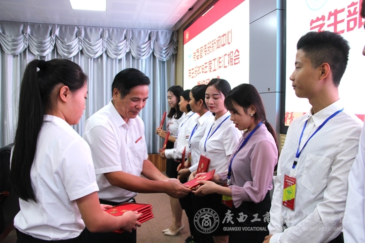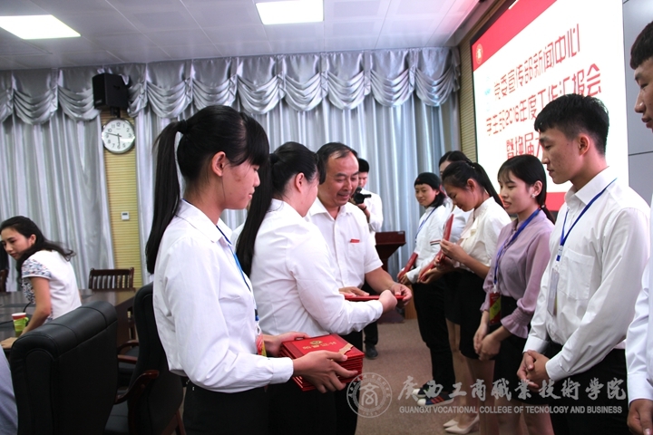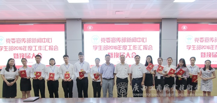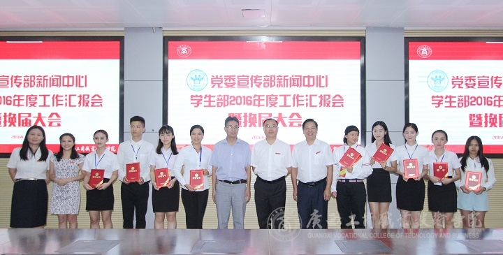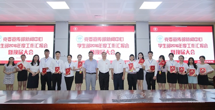 會議最后,由蒙啟成副書記為粟蘭惠、梁禮娜、李蓉榮等新聞中心獲得廣商院2015-2016年“優(yōu)秀記者”的同學頒發(fā)證書;韋勝強部長和林雯副部長分別為新聞中心獲得廣商院“新文化建設貢獻突出者”、“防艾微電影貢獻者”的同學頒發(fā)證書,韋勝強部長還現(xiàn)場為新聞中心14級全體成員頒發(fā)了聘書。