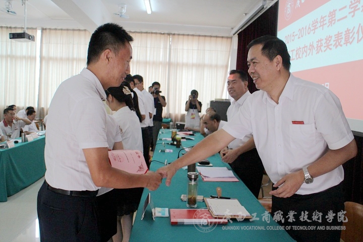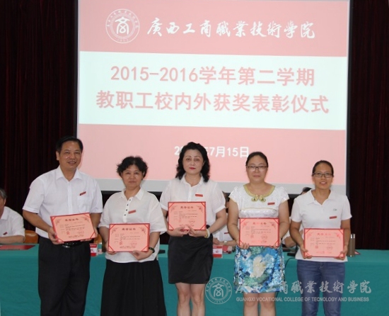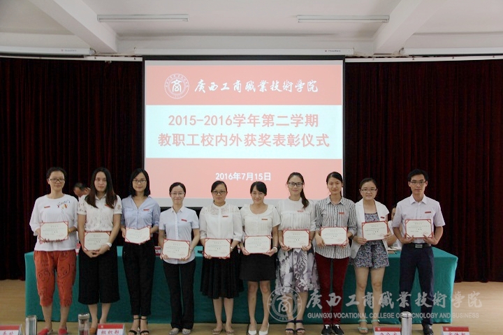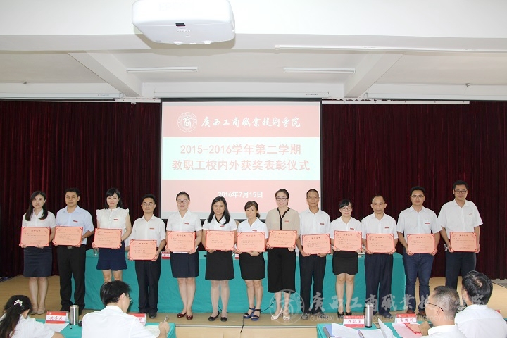 2016年7月15日下午,我院于校本部教學(xué)樓2145報告廳隆重舉行2015—2016學(xué)年第二學(xué)期教職工校內(nèi)外獲獎表彰儀式。學(xué)院黨委書記覃武云、院長、黨委副書記陳杰、黨委副書記、紀(jì)委書記蒙啟成、副院長李維、副廳級調(diào)研員黃永蓬以及各部門領(lǐng)導(dǎo)、教職工出席了本次會議。會議由蒙啟成副書記主持。