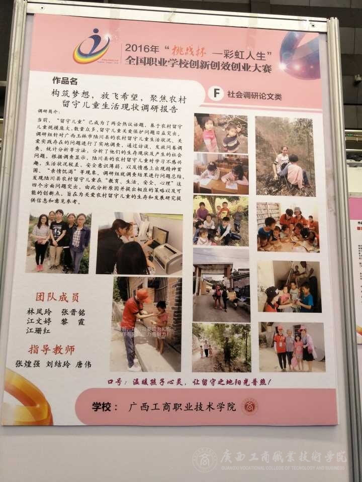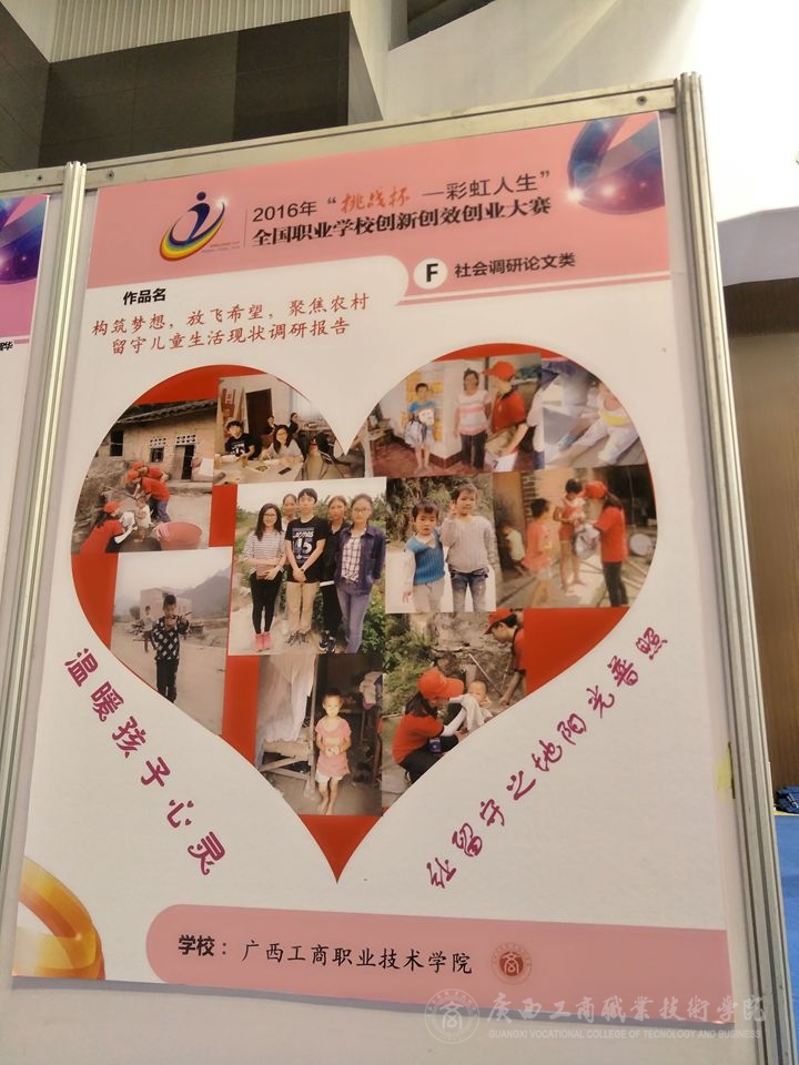由團(tuán)中央、教育部、人社部、中國科協(xié)、全國學(xué)聯(lián)、省政府共同主辦,團(tuán)省委、省教育廳、省人社廳、省科協(xié)、省學(xué)聯(lián)、福州市政府、福建師范大學(xué)共同承辦的2016年“挑戰(zhàn)杯——彩虹人生”全國職業(yè)學(xué)校創(chuàng)新創(chuàng)效創(chuàng)業(yè)大賽總決賽于今年8月11-14日在福建福州隆重拉開帷幕。我院的參賽作品《構(gòu)筑夢想,放飛希望,聚焦農(nóng)村留守兒童生活現(xiàn)狀調(diào)研報(bào)告——以廣西玉林市陸川縣為例》(指導(dǎo)教師:張煌強(qiáng)、劉結(jié)玲、唐偉)在全區(qū)初賽和全國復(fù)賽中脫穎而出,代表廣西社會調(diào)研論文類進(jìn)入了全國總決賽。8月10日,我院參賽代表隊(duì)在學(xué)院團(tuán)委副書記趙婷老師的帶領(lǐng)下,前往福建福州參加今年的總決賽。