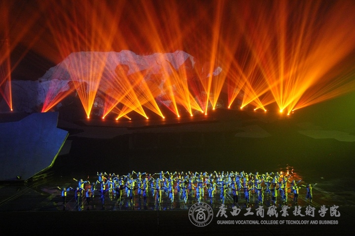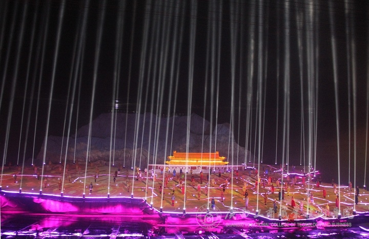 在演出開(kāi)始前,淋淋瀝瀝地下起雨,老師和同學(xué)們穿著雨衣?lián)沃陚忝坝昵靶?,熱情不減。神奇的是演出一開(kāi)始雨就停了,有的學(xué)員興奮地說(shuō)道“毛主席是一直在‘保佑’我們的呀”,這絕非迷信,而是一種對(duì)毛主席感情的流露啊。演出開(kāi)始,舞臺(tái)上數(shù)不清的光束成網(wǎng)格狀鋪向?qū)γ娼倜走h(yuǎn)的青山,隨著音樂(lè)起舞,流光溢彩,美輪美奐,場(chǎng)面蔚為壯觀。突然時(shí)空瞬間轉(zhuǎn)移到1921年的安源煤礦大罷工現(xiàn)場(chǎng),演出由此拉開(kāi)序幕。