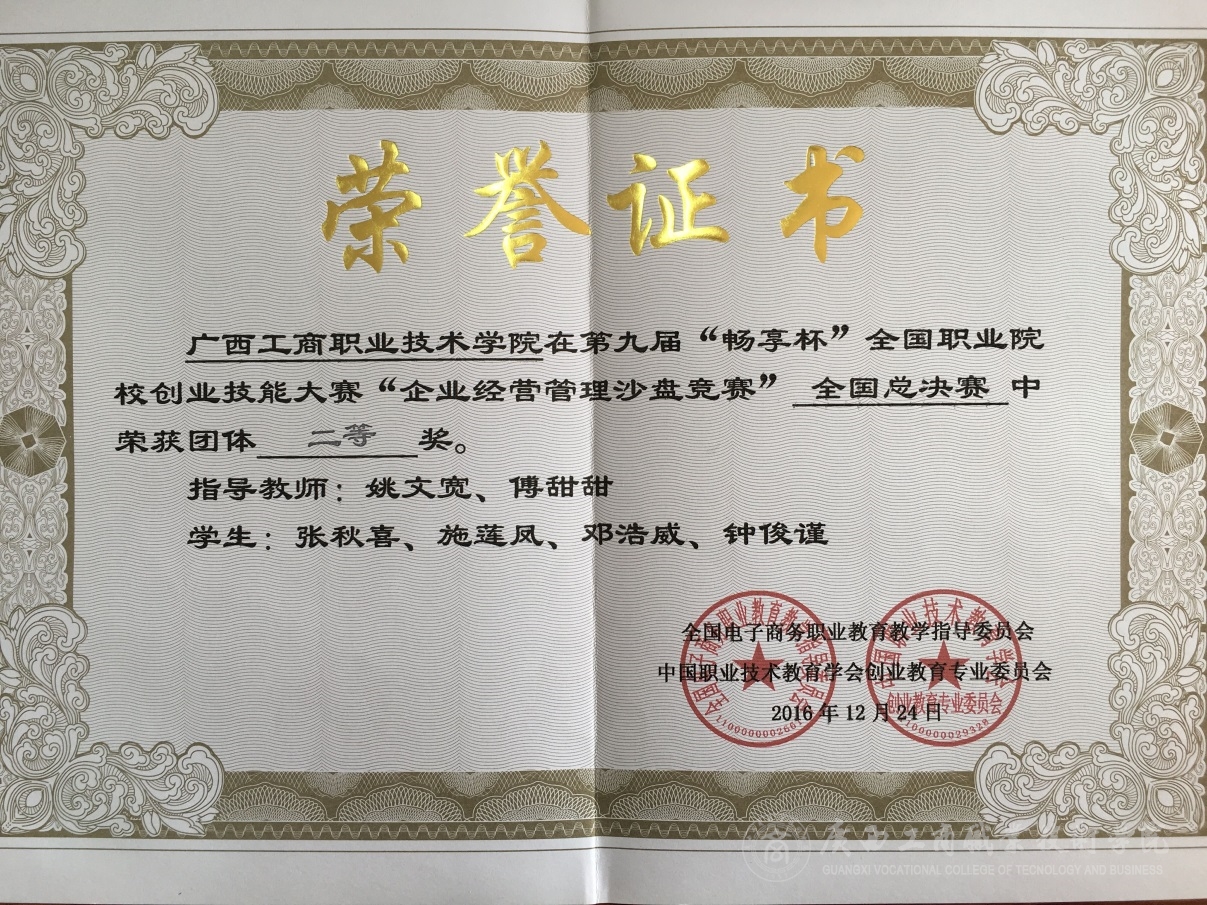 2016年12月23-25日,經(jīng)管系派出一支企業(yè)經(jīng)營(yíng)管理沙盤(pán)隊(duì)伍代表學(xué)院赴山東泰安市參加第九屆“暢享杯”全國(guó)職業(yè)院校創(chuàng)業(yè)技能大賽“企業(yè)經(jīng)營(yíng)管理沙盤(pán)競(jìng)賽”全國(guó)總決賽。經(jīng)過(guò)參賽隊(duì)員的奮力拼搏,我院榮獲二等獎(jiǎng)的好成績(jī)。