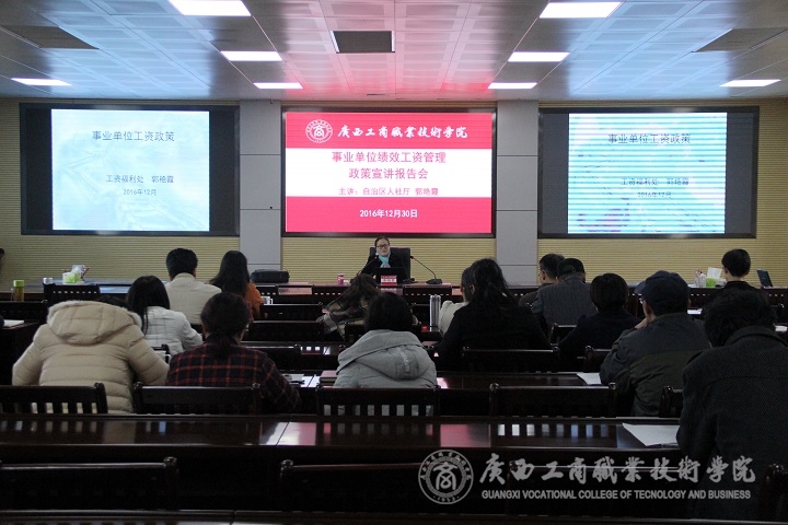 為推進我??冃ЧべY制度的實施工作,使全校教職員工更清楚地了解其方針、政策、實施辦法。2016年12月30日上午,我院事業(yè)單位績效工資管理政策宣講報告會在校本部召開。我院教師參加本次報告會。會議由自治區(qū)人力資源和社會保障廳廳郭艷霞處長、江河??崎L主講。