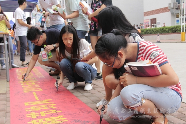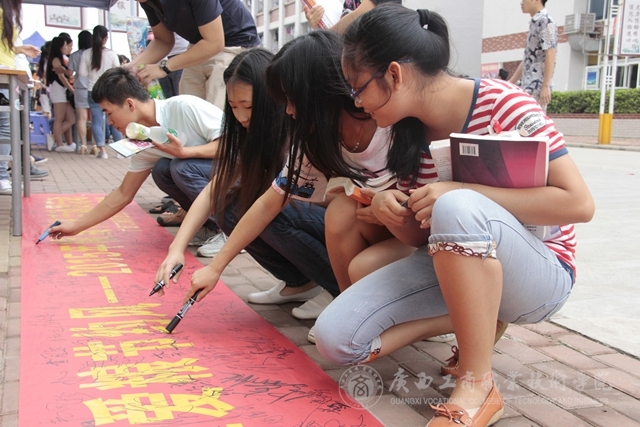2015年5月25日中午,我院在校本部食堂前舉行糧食科技活動周——節(jié)糧倡議簽名活動并發(fā)放愛糧節(jié)糧科普宣傳冊。簽名活動現(xiàn)場“糧食科技活動周”的宣傳橫幅格外醒目,過往的同學、老師們甚至是掃地的阿姨都紛紛駐足停留在橫幅前,參與簽名活動,在橫幅上留下自己的名字。活動現(xiàn)場還給同學們派發(fā)了關(guān)于節(jié)約糧食的宣傳冊子,冊子上“一滴汗,一滴糧”“我光盤,我光榮”等宣傳標語引人深思,同學們拿過宣傳冊邊走邊看。