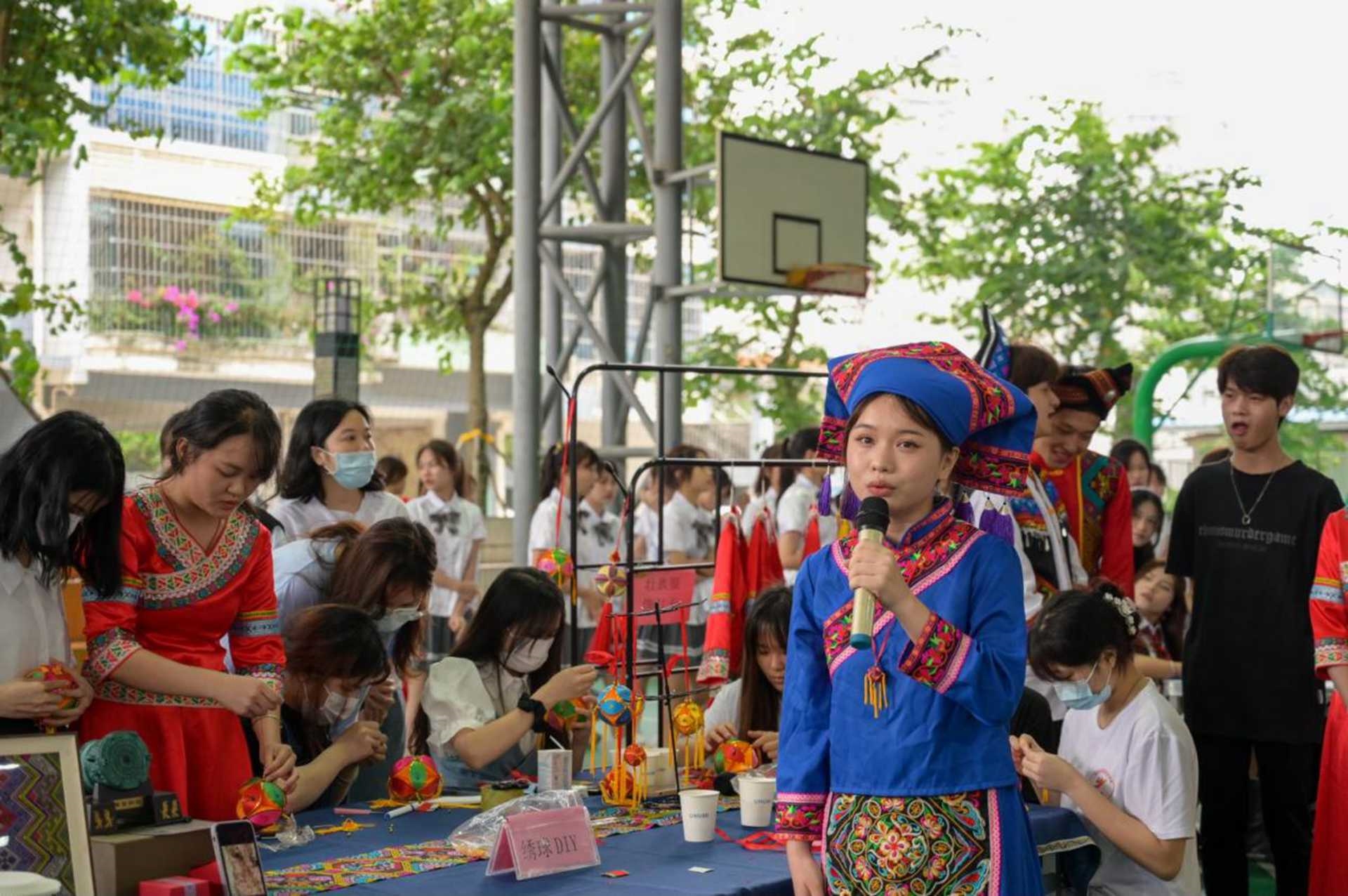 糧油康旅學院開展專業(yè)技能展演活動,糧食儲運與質量安全專業(yè)現(xiàn)場展演糧食原料認知、食品快檢技術;食品檢驗檢測技術專業(yè)開展BMI測量并提供營養(yǎng)配餐、壯族藥膳制作介紹與品嘗、DIY壯族特色保健藥包活動;食品智能加工專業(yè)展示各類米制食品的加工,如五色糯米飯、糯米酒等;酒店管理與數(shù)字化運營專業(yè)開展壯鄉(xiāng)主題調酒展演、主題茶藝展演;旅游管理專業(yè)開展組織師生體驗旅游文創(chuàng)產(chǎn)品、體驗繡球和銅鼓手工制作;嬰幼兒托育服務與管理專業(yè)開展舞蹈、音樂情景劇、手工、繪畫、韻律操等表演。