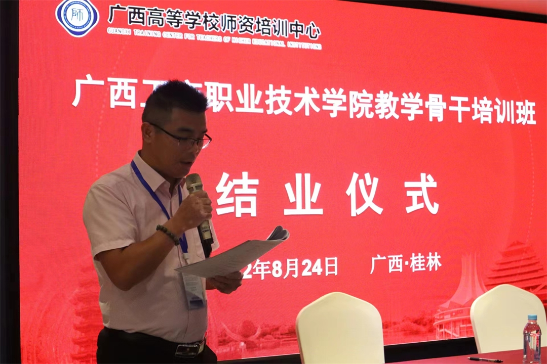 8月24日,學(xué)院2022年教學(xué)管理干部及骨干教師能力提升培訓(xùn)班結(jié)業(yè)儀式在桂林市悅璟酒店六樓會(huì)議廳舉行。結(jié)業(yè)儀式由廣西高等學(xué)校師資培訓(xùn)中心陳治萍副主任主持,學(xué)院紀(jì)委書記韋云鳳出席并講話,全體學(xué)員參加。