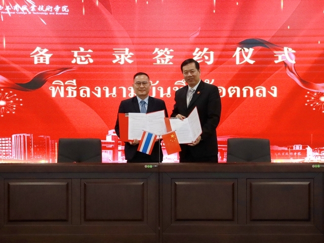 在友好融洽的氛圍中,李維院長與宋才·孟泰松校長代表雙方簽署教育合作備忘錄,李維院長代表學(xué)院向清萊皇家大學(xué)贈送特色禮物。