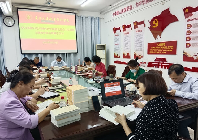在鵬飛校區(qū)多個會議室和“紅灣”主題閱讀體驗區(qū),同志們凝心靜氣,認真研讀黨的二十大報告、中國共產黨章程、《習近平著作選讀》《習近平新時代中國特色社會主義思想專題摘編》等必讀書目和《習近平新時代中國特色社會主義思想學習綱要》等選讀書目,拓展學習習近平總書記在主題教育工作會議上的重要講話、習近平總書記對廣西“五個更大”重要要求等關于廣西地區(qū)和教育領域的特色材料。