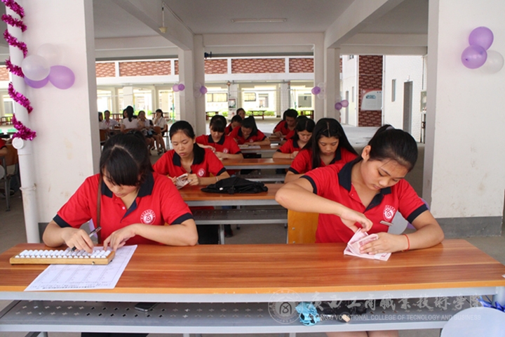 同時,會計系學(xué)生在學(xué)生公寓樓架空層展示點鈔、珠算的技能,嫻熟的珠算打法,撥動的算珠敲擊著算盤框,聲聲連珠陣陣響,學(xué)生低頭認(rèn)真點鈔,速度手法技巧令人折服。