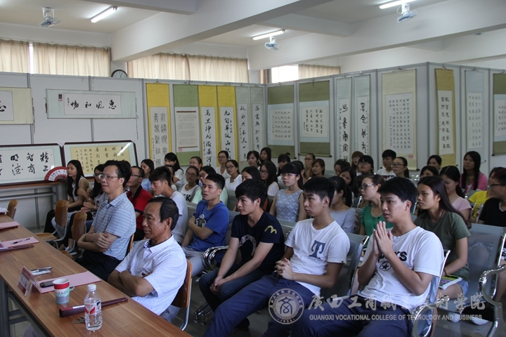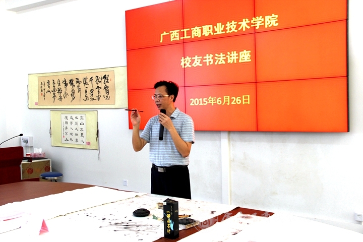此次書法講座會(huì)上,廣西書法家協(xié)會(huì)常務(wù)副主席劉德宏上臺(tái)給在場(chǎng)各位講評(píng)了“書法有道”的概念。同大家觀看了一些自己的書法作品并熱情的與大家分享自己的創(chuàng)作心得以及自己在書法道路上的故事。接著自治區(qū)糧食局人事處處長韋尚英上臺(tái)發(fā)表講話,向大家講起了往年自己參加的一些書法比賽,就如何提高同學(xué)們對(duì)書法的興趣、書法基礎(chǔ)要領(lǐng)、如何寫好書法等問題做了詳細(xì)的講解并給同學(xué)們示范了一些字的點(diǎn)筆與勾勒。