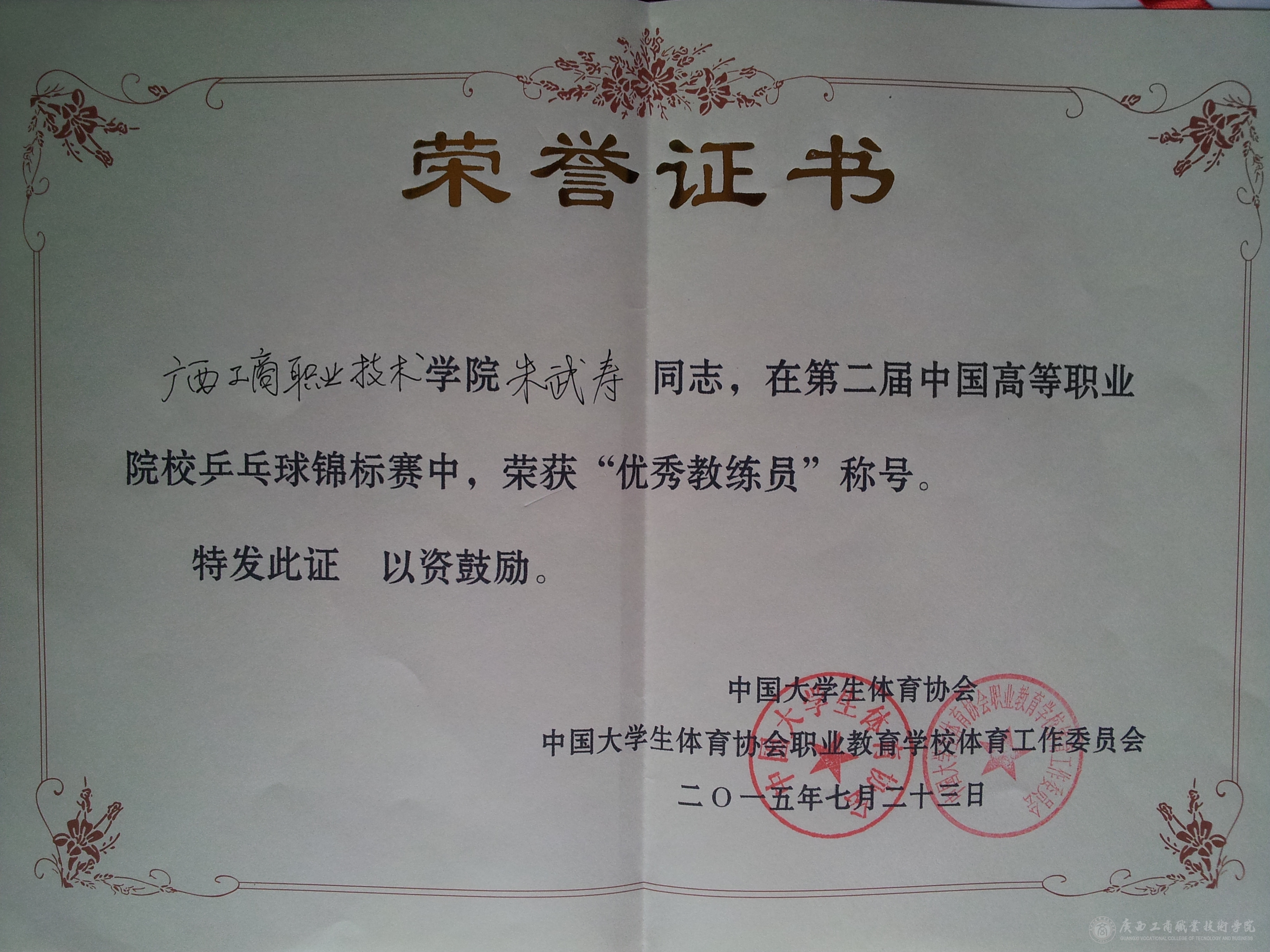 朱武壽榮獲“優(yōu)秀教練員”稱號(hào)