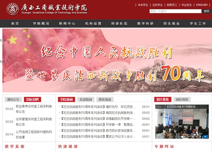 利用網(wǎng)絡(luò)平臺擴(kuò)大紀(jì)念活動受眾。在學(xué)院網(wǎng)站主頁開設(shè)了紀(jì)念中國人民抗日戰(zhàn)爭勝利70周年“網(wǎng)上祭英烈”的網(wǎng)頁。并組織全校師生員工登錄學(xué)院網(wǎng)站主頁,向抗戰(zhàn)英烈鮮花留言,在網(wǎng)上高揚(yáng)愛國主義主旋律,凝聚牢記歷史、圓夢中華的網(wǎng)上正能量。在學(xué)院主頁最顯著的頭圖位置更新主題為紀(jì)念中國人民抗日戰(zhàn)爭暨世界反法西斯戰(zhàn)爭勝利70周年圖片,在網(wǎng)絡(luò)平臺上營造濃厚的紀(jì)念氛圍。同時,利用微信、微博等新媒體推送紀(jì)念抗戰(zhàn)勝利70周年相關(guān)內(nèi)容,多渠道擴(kuò)大紀(jì)念活動受眾。