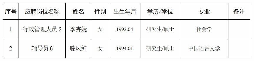 根據(jù)《廣西壯族自治區(qū)事業(yè)單位公開招聘人員實施辦法》(桂人社發(fā)﹝2011﹞155號)、《關于進一步規(guī)范區(qū)直事業(yè)單位公開招聘工作的通知》(桂人社辦發(fā)〔2013〕135號)、《關于進一步完善事業(yè)單位公開招聘工作的通知》(桂人社規(guī)〔2021〕7號)和《廣西工商職業(yè)技術學院2023年第一批公開招聘非實名人員控制數(shù)人員公告》相關規(guī)定,經(jīng)公開招聘規(guī)定的程序,經(jīng)研究,擬聘用季卉婕等2位同志到我院工作,現(xiàn)將擬聘人員名單(第四輪)予以公示,公示期為7日(2023年9月15日至2023年9月21日)。公示期內(nèi)如對擬聘人員有異議,請以書面形式,并署真實姓名、聯(lián)系方式及聯(lián)系地址,于2023年9月21日18:00前寄送到廣西工商職業(yè)技術學院人事處(直接送達以送達日期為準,郵寄以寄出郵戳為準)。地址:廣西南寧市鵬飛路15號廣西工商職業(yè)技術學院人事處(2212辦公室);聯(lián)系人:韋老師、李老師;郵編:530008;電話:0771-3160065。如實反映擬聘用人員的有關問題受法律保護。