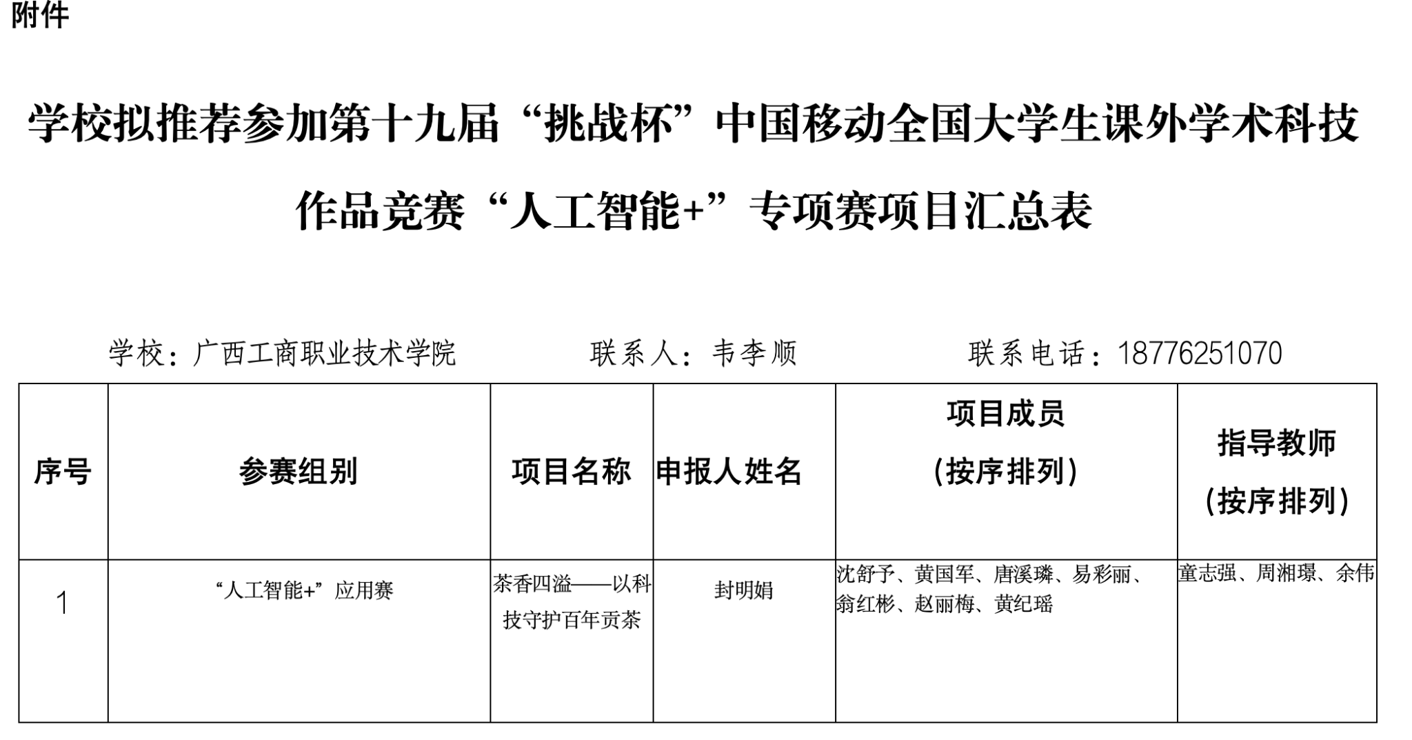 根據(jù)《關(guān)于參加第十九屆“挑戰(zhàn)杯”中國移動全國大學(xué)生課外學(xué)術(shù)科技作品競賽“人工智能+”專項(xiàng)賽的工作指引》,經(jīng)學(xué)生自主報(bào)名提交作品,學(xué)校遴選,擬推薦《茶香四溢——以科技守護(hù)百年貢茶》至共青團(tuán)廣西區(qū)委、全國組委會參加評審,現(xiàn)進(jìn)行公示,詳見附件。