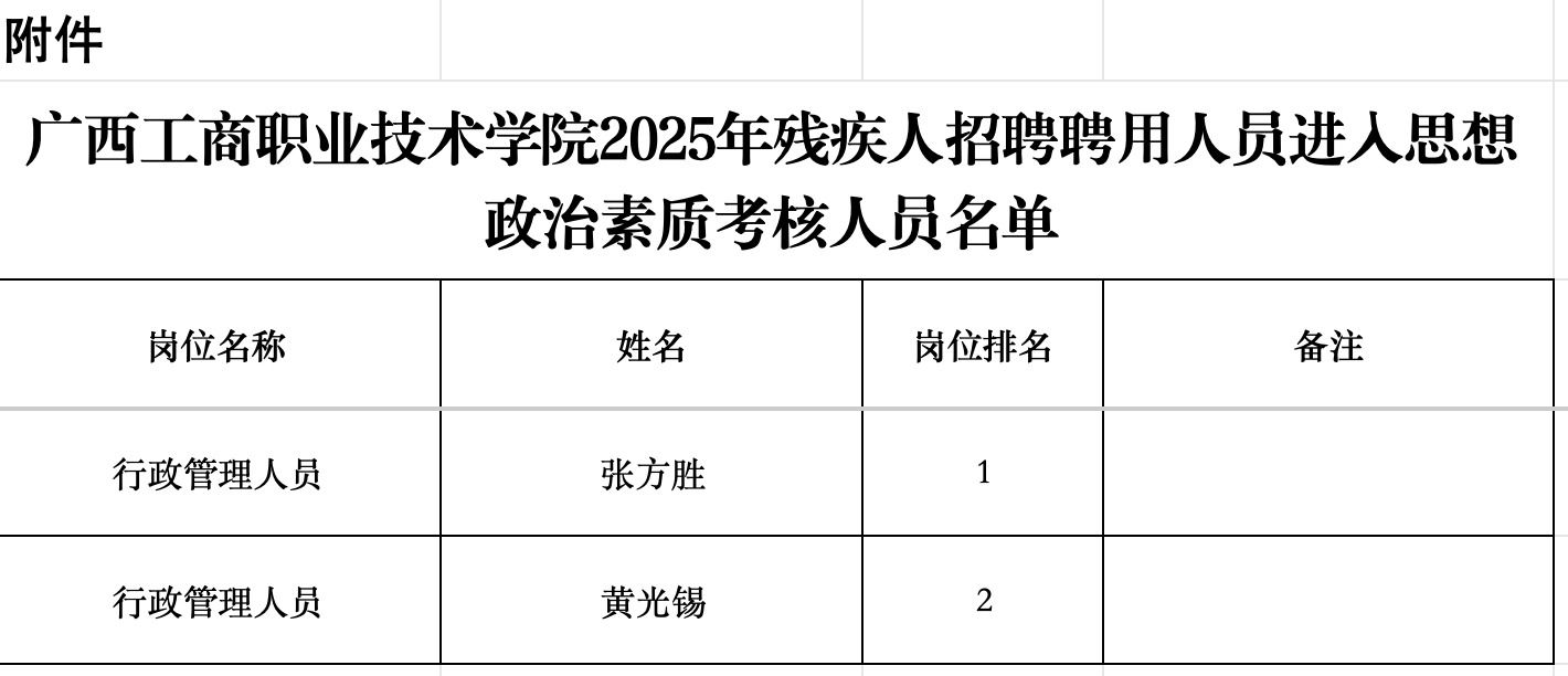 附件:廣西工商職業(yè)技術學院2025年殘疾人招聘聘用人員進入思想政治素質考核人員名單